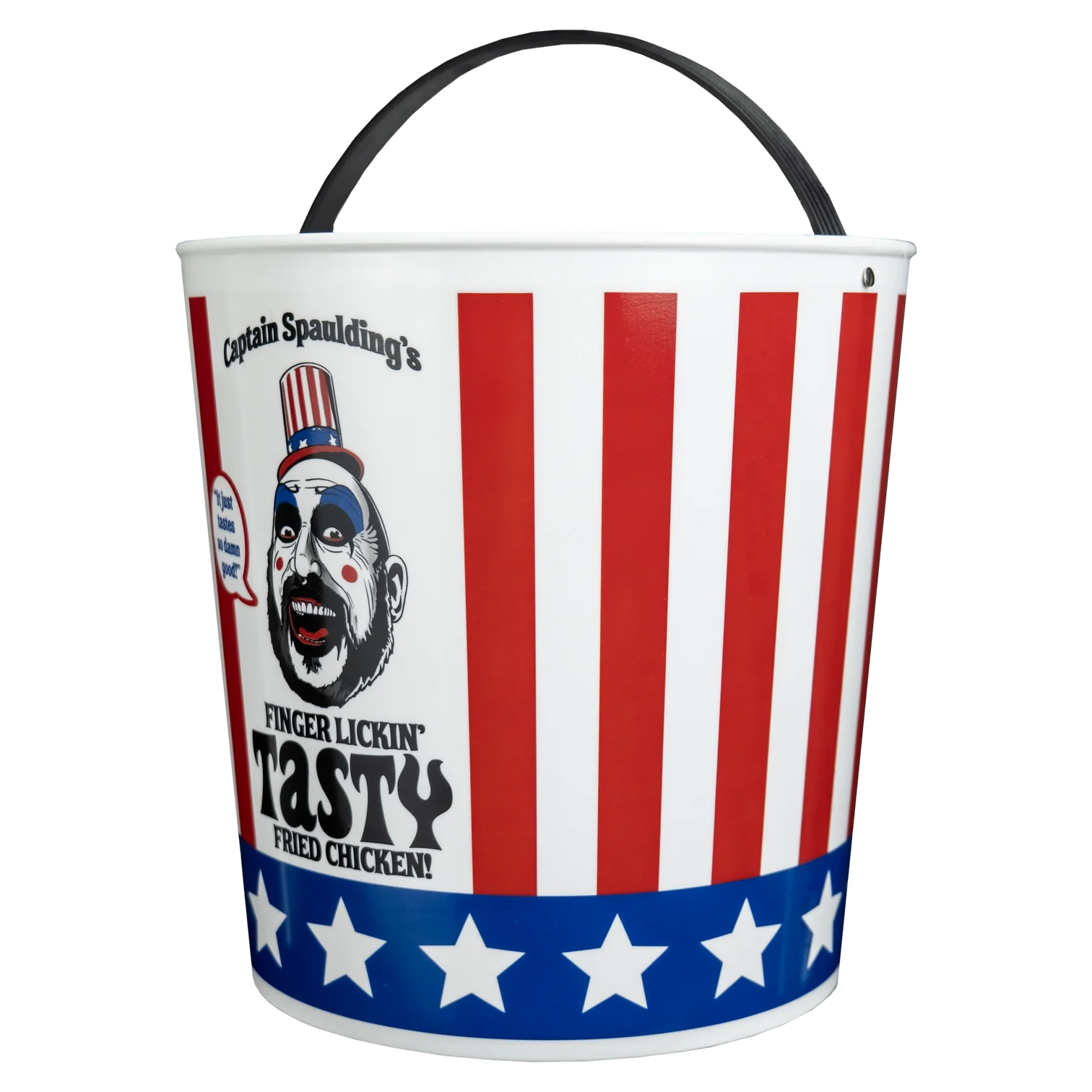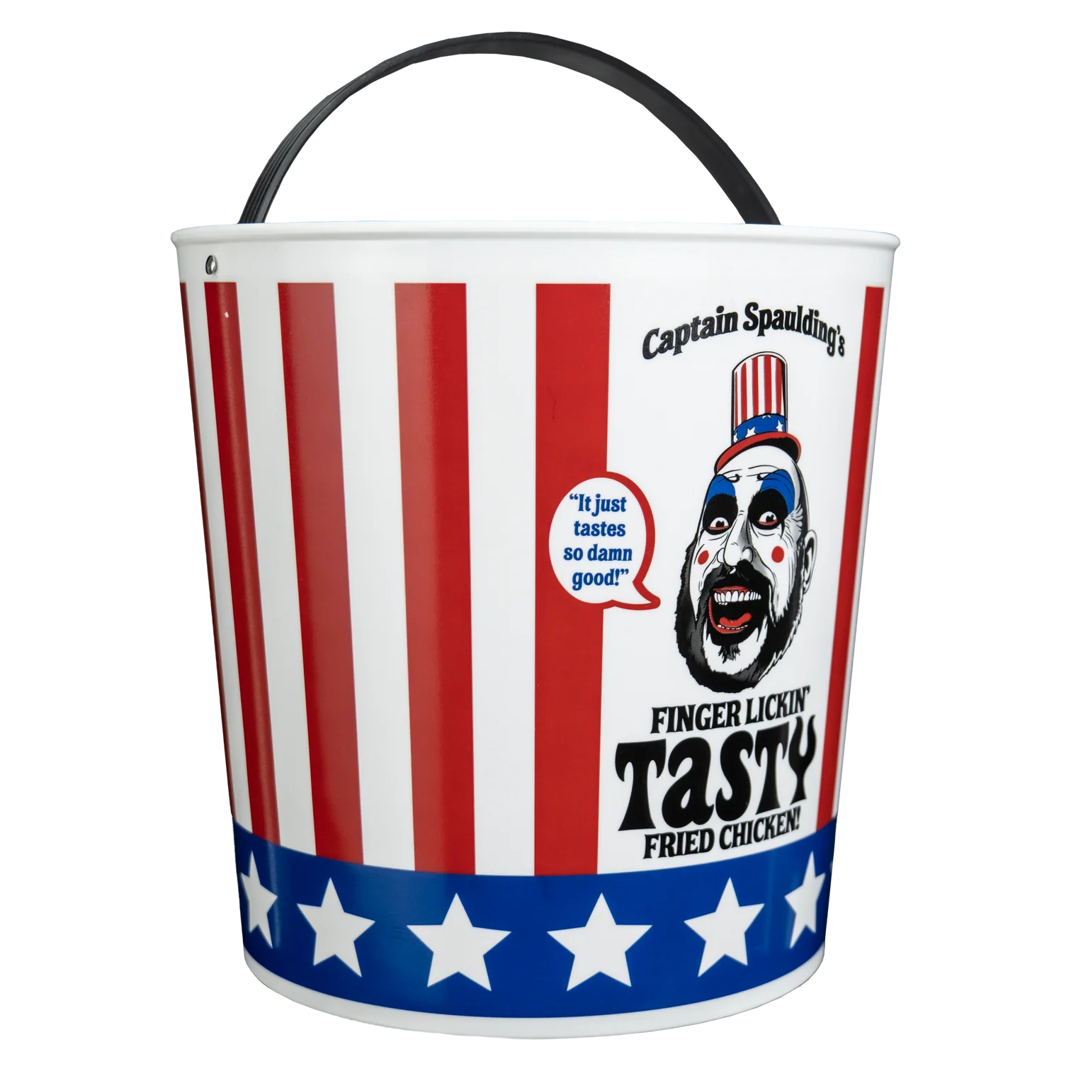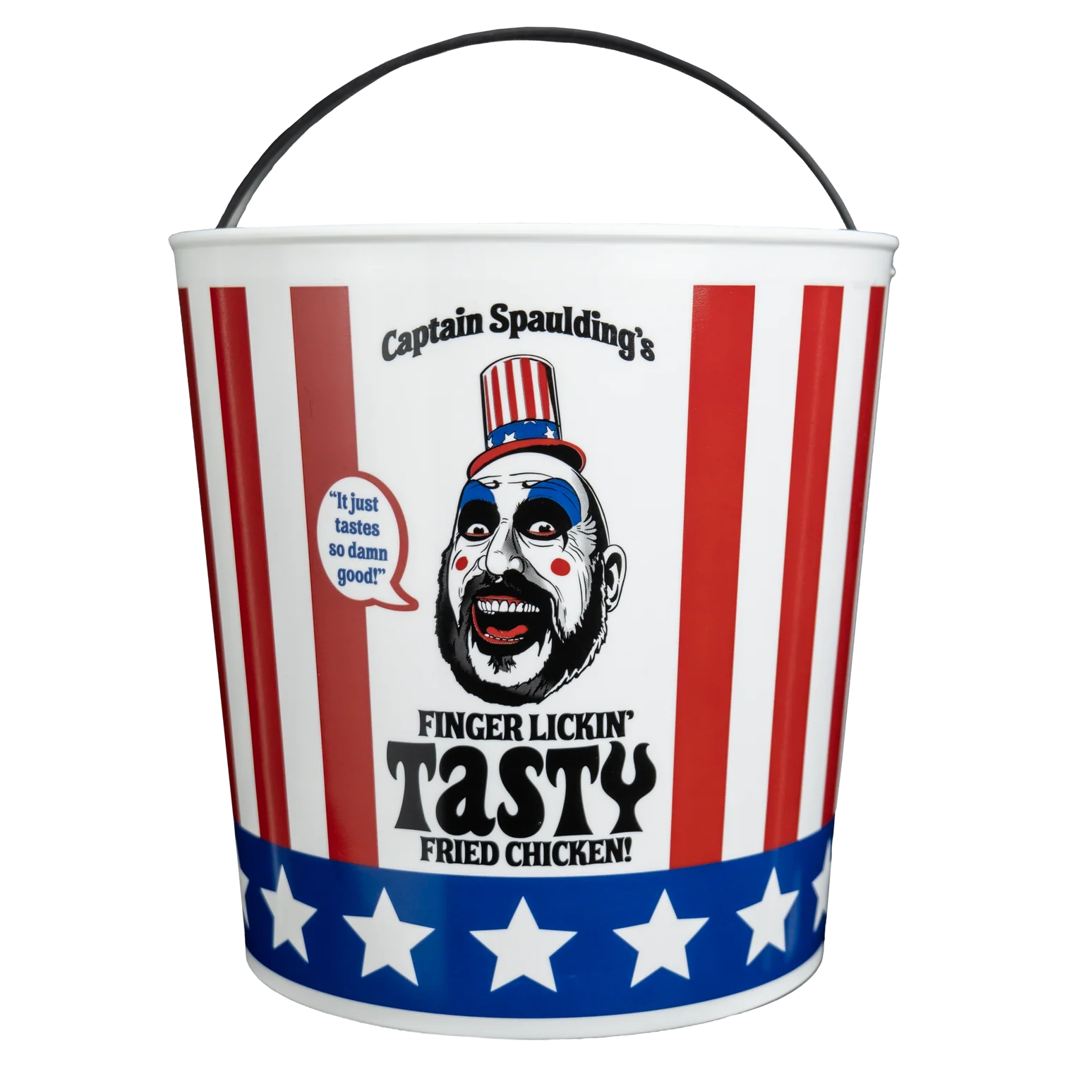 The House of 1000 Corpses Chicken Bucket Candy Pail is inspired by Captain Spaulding’s fried chicken empire and roadside horrorshow. Standing at approximately 8" tall with a sturdy, flexible plastic handle, it’s the perfect companion for a night of trick-or-treating madness.