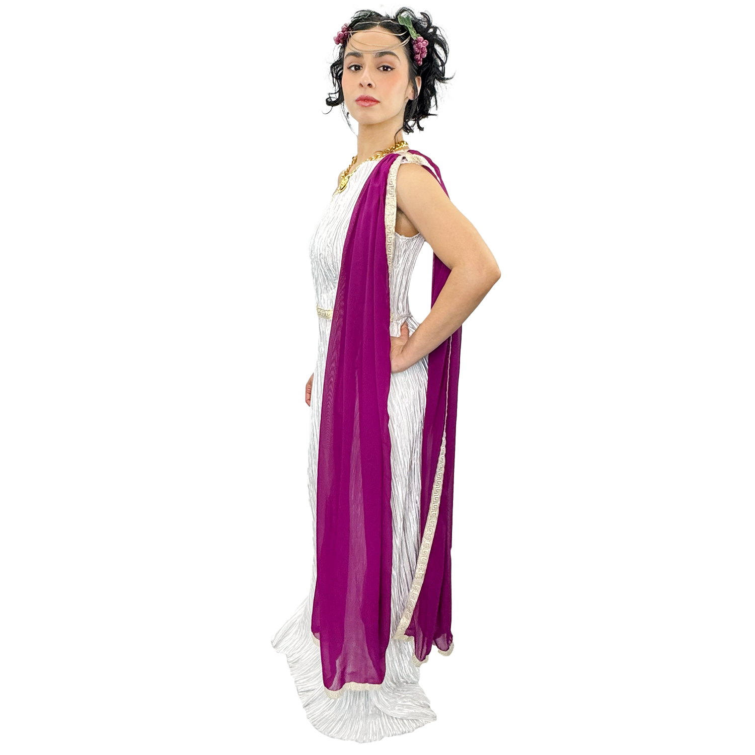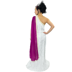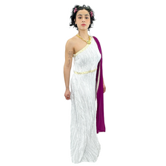 Elevate your costume game with the International Greek Goddess Persephone Adult Costume. This stunning ensemble includes a white and gold dress, a regal purple sash, a decadent gold necklace, and a majestic headpiece. Available to rent or buy, this one size fits most costume exudes elegance and sophistication. Additional accessories are also available for purchase online or in-store. Transform into a divine deity and command attention at any party or event.