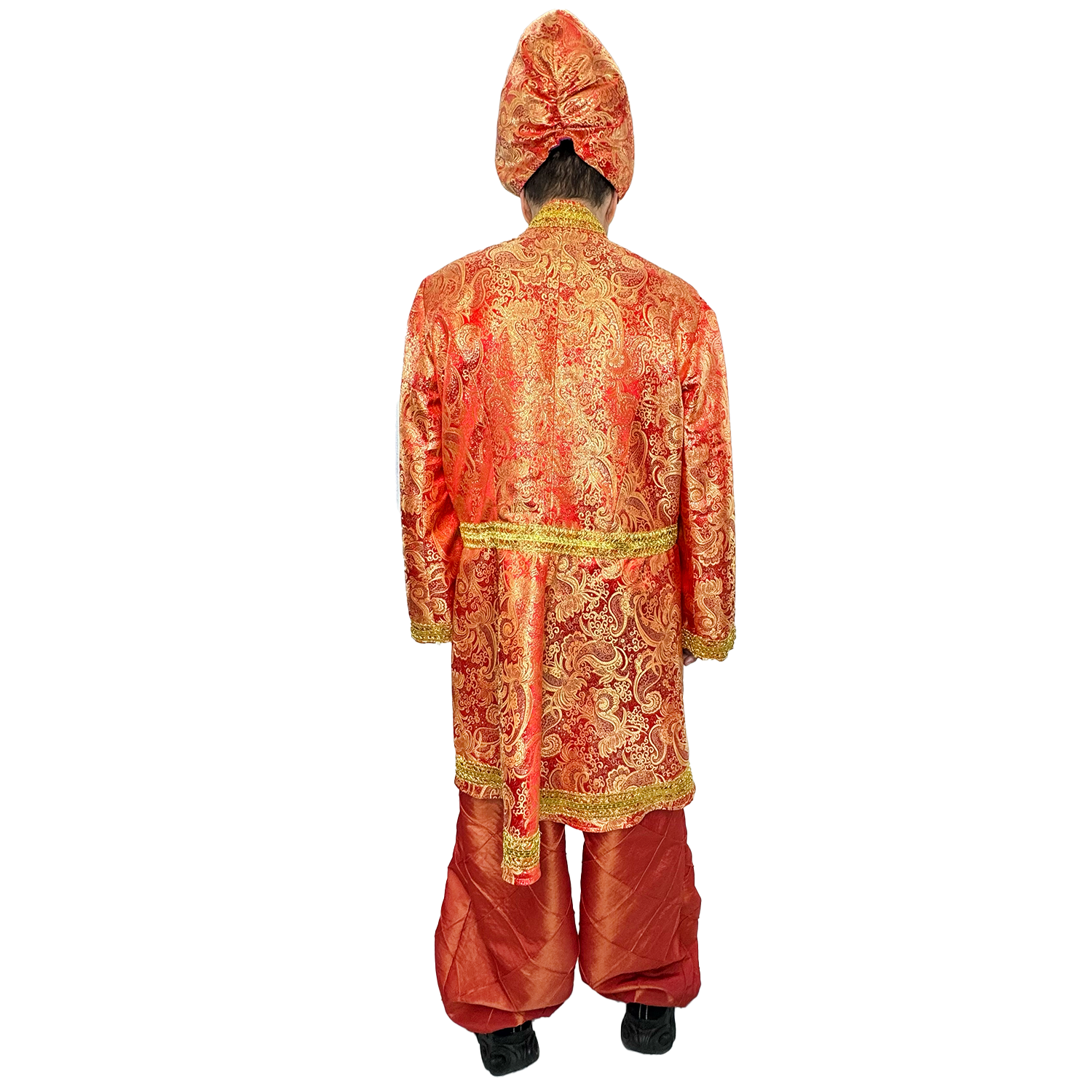 This exquisite International Premium Orange Brocade Sultan Adult Costume is handcrafted with attention to detail. The exclusive design features a brocade jacket, matching turban, and elastic pants, available in sizes medium and large for both purchase or rental. Complement your look with additional accessories, available for purchase online or in-store. Elevate your costume game with this authentic and versatile ensemble.