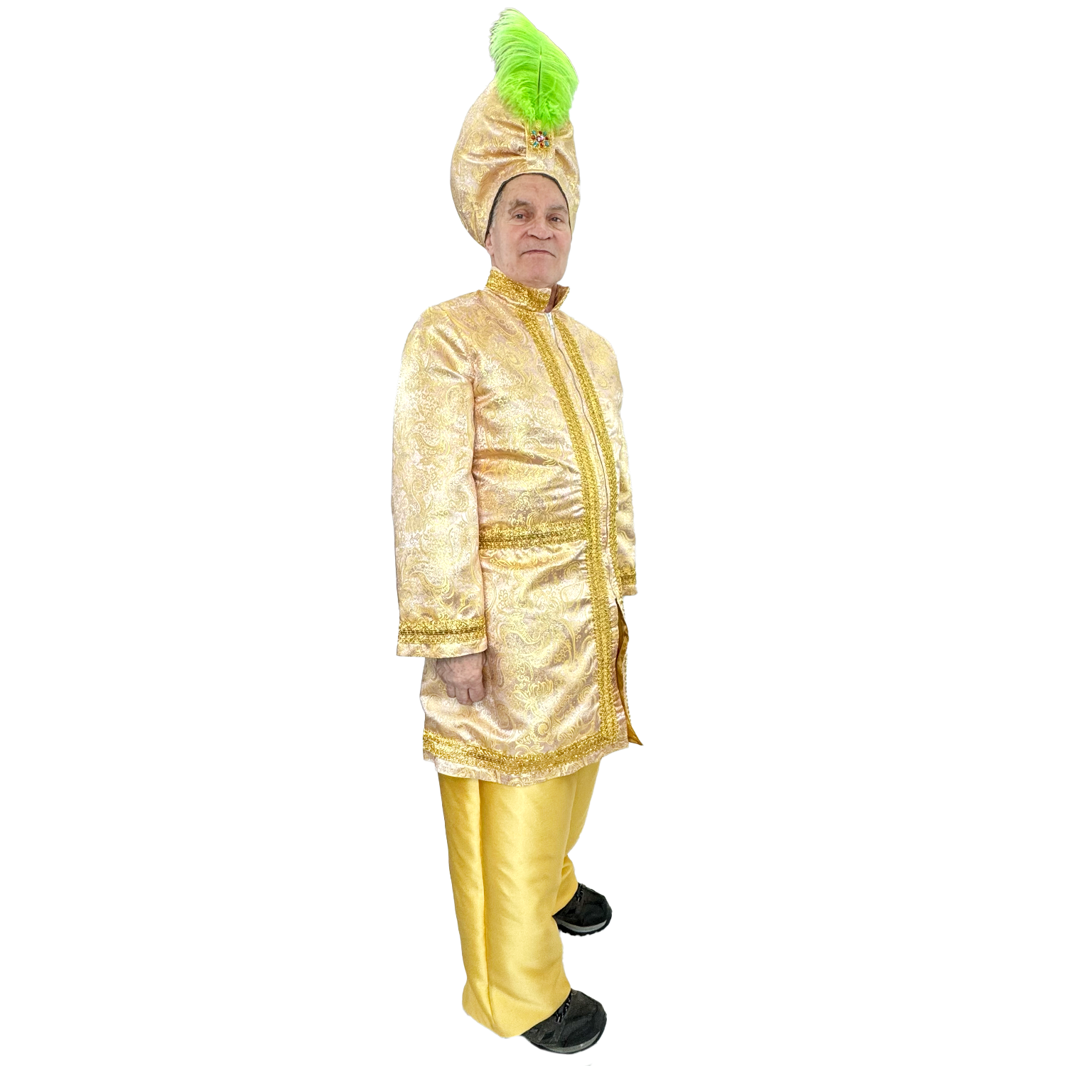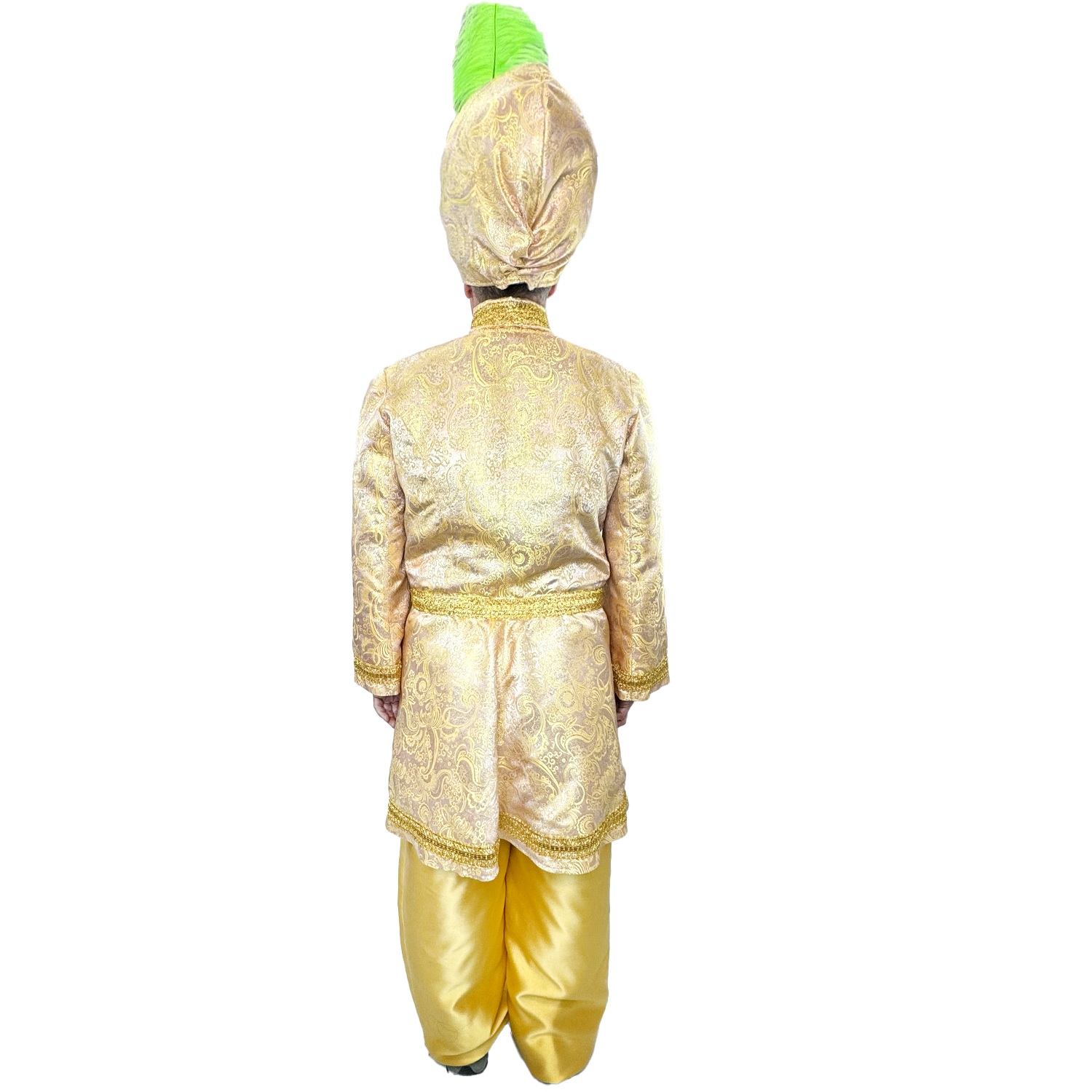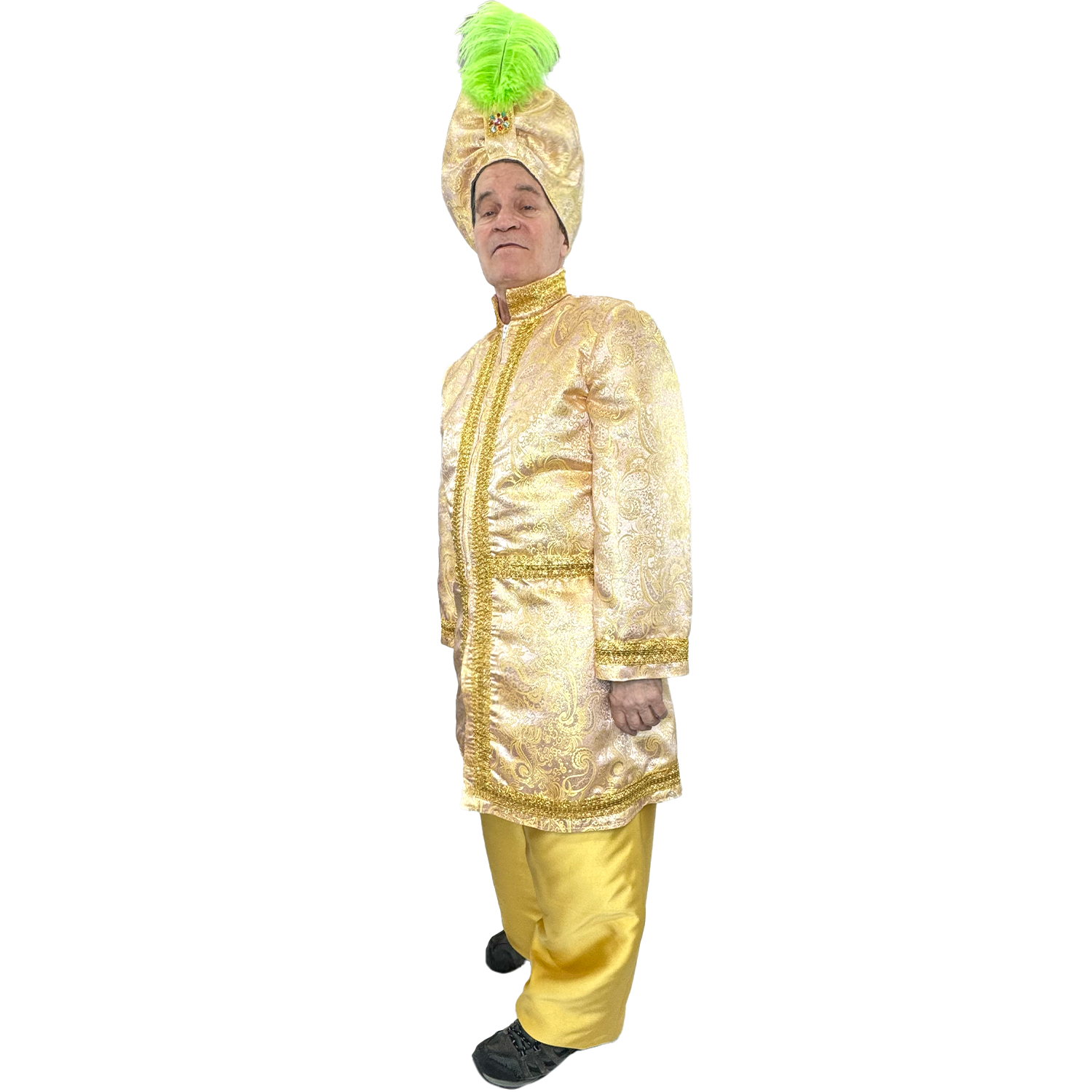 Expertly handcrafted and exclusively available from Abracadabra, the International Premium Peach Sultan Adult Costume exudes opulence. Complete with a brocade jacket, gold pants, and matching turban, this costume is perfect for a small size. Plus, elevate your look with additional accessories available for purchase online or in-store. Rent or buy now for an enchanting ensemble.