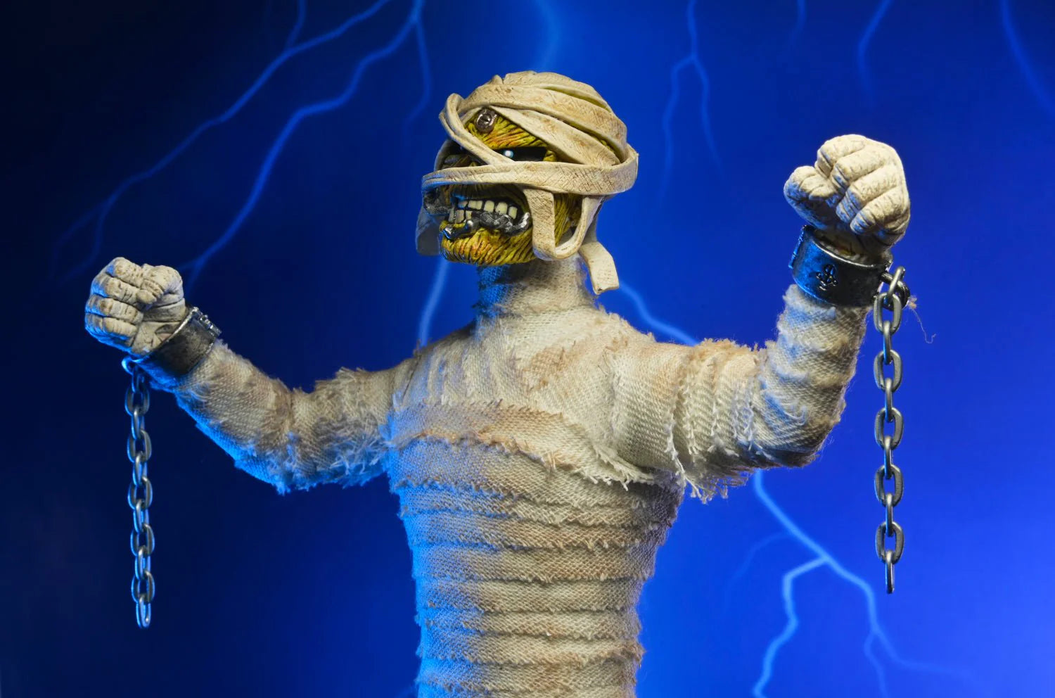 The Pharaoh of Metal has returned from the tomb! NECA celebrates the 40th anniversary of Iron Maiden’s legendary Powerslave album with a reissue of their fan-favorite Eddie Mummy action figure—just in time to rattle some sarcophagi. This 8-inch cloth-clad collectible immortalizes Eddie as he appeared on the artwork for the 1984–1985 World Slavery Tour: bound in weathered bandages, shackled in real metal chains, and grinning like only the undead can. Whether he's imprisoned or unhinged, he's ready to headline your shelf.