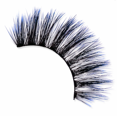 Full volume segmented lashes with a splash of blue on the tips. Shorter wisps of lashes are in the inner and outer corners, longer lashes are centralized.