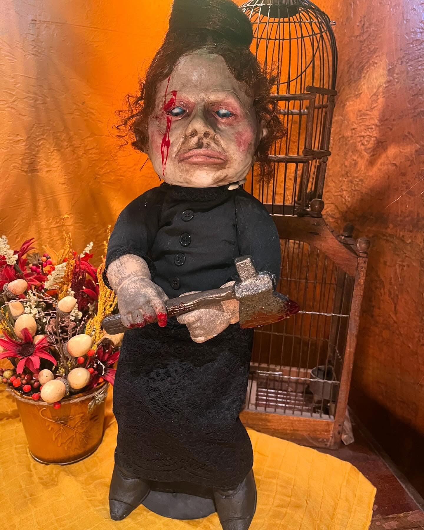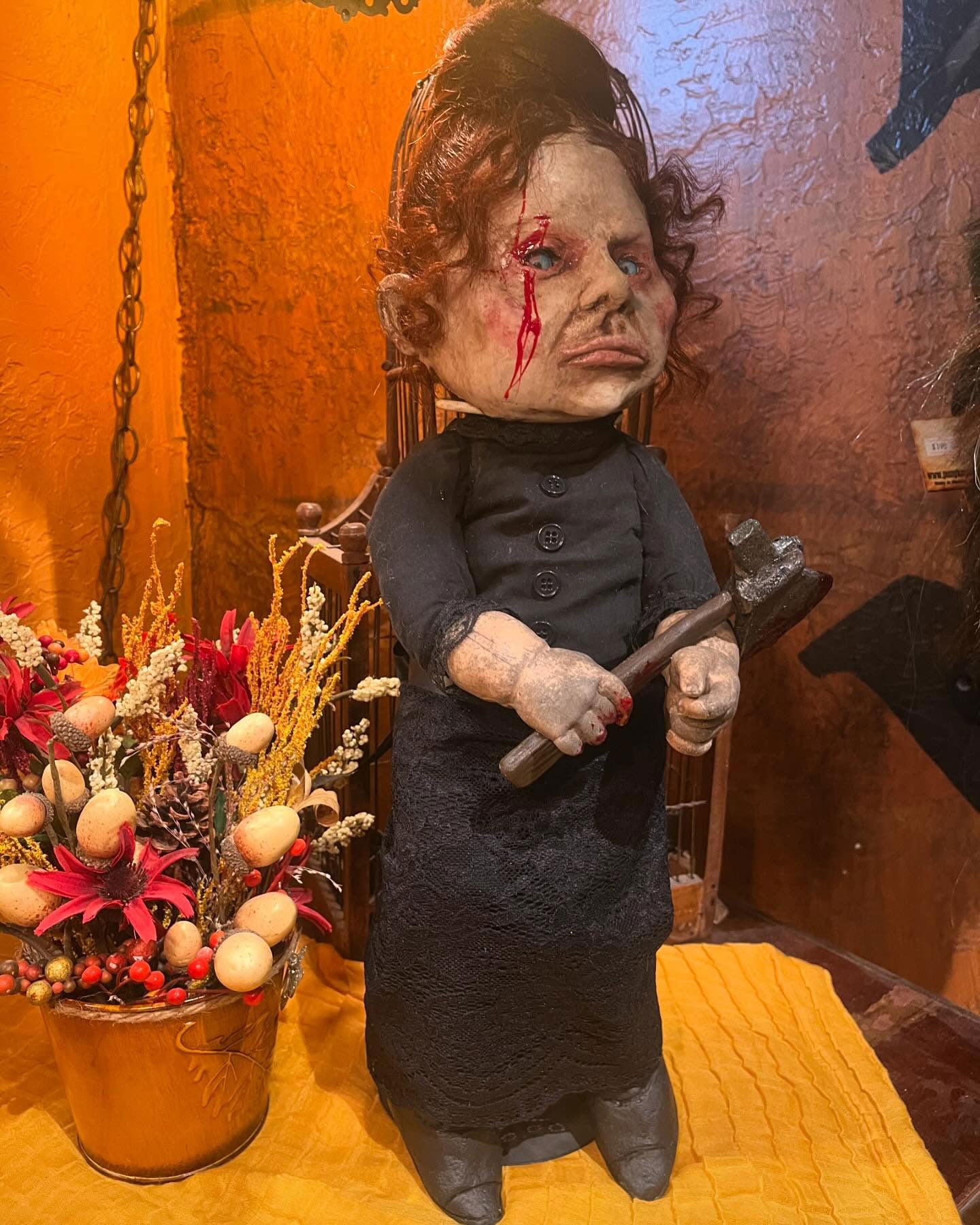 Lizzie Borden took an axe…. Lizzie comes with her black laced dress, boots, and bloody hatchet. Staring into your eyes with a look that spirals into madness!