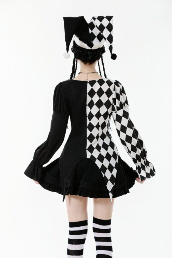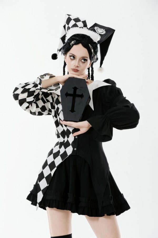 Step into the spotlight with this playful Lolita Harlequin Diamond Jester Pattern Shirt. Featuring a bold black and white diamond print inspired by classic jester aesthetics, this long-sleeved top brings theatrical flair to your wardrobe. The crisp white collar adds a refined touch to the whimsical design, perfect for those who embrace fun, unconventional style. Whether you're channeling vintage carnival vibes or making a statement at themed events, this shirt delivers personality and charm in every wear.