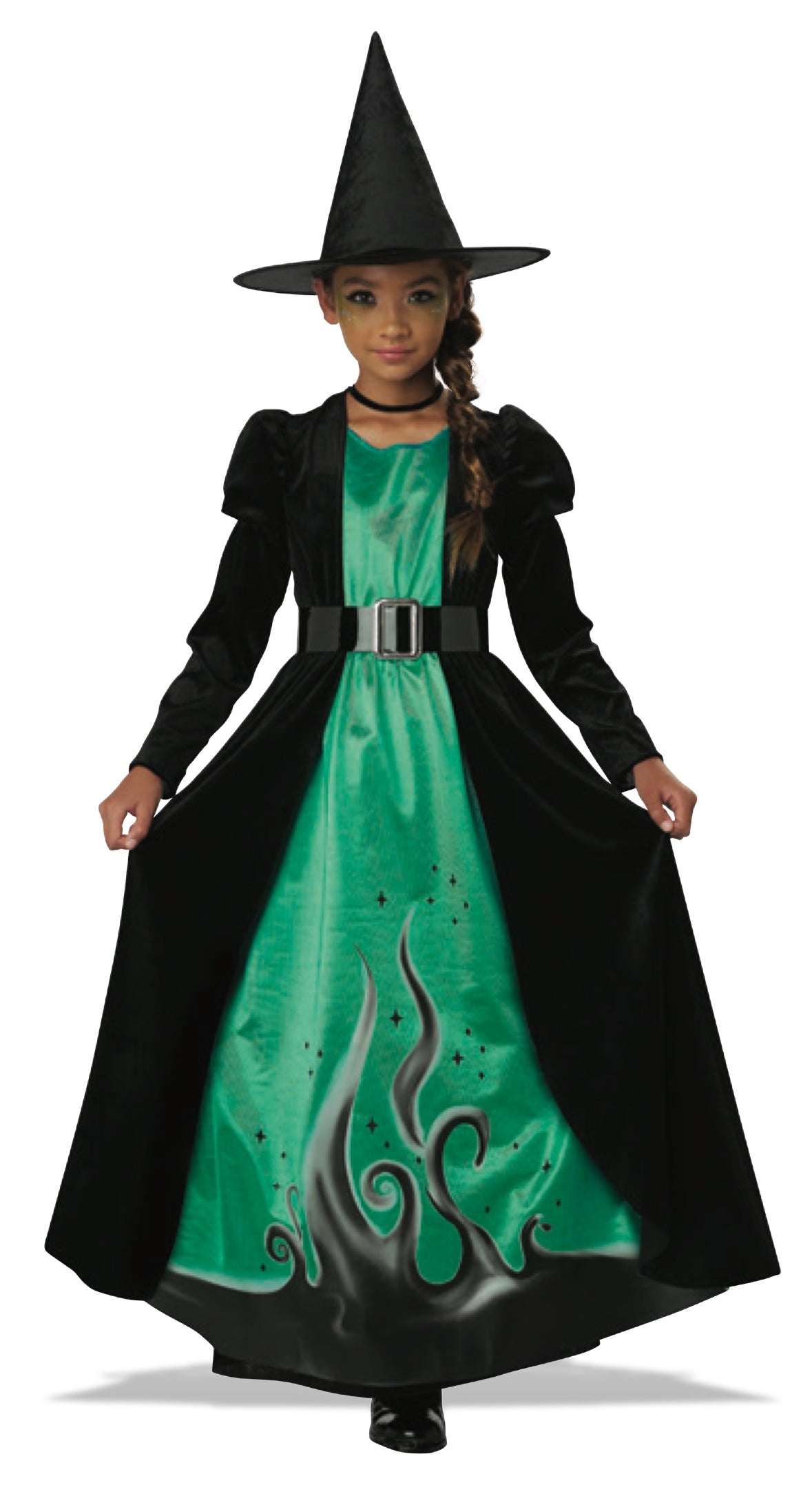 Your little spell caster is sure to charm everyone in this Marvelous Witch Costume! This classic witch set includes a gorgeous black dress with a mystical green satin panel, complete with a matching hat and belt.
