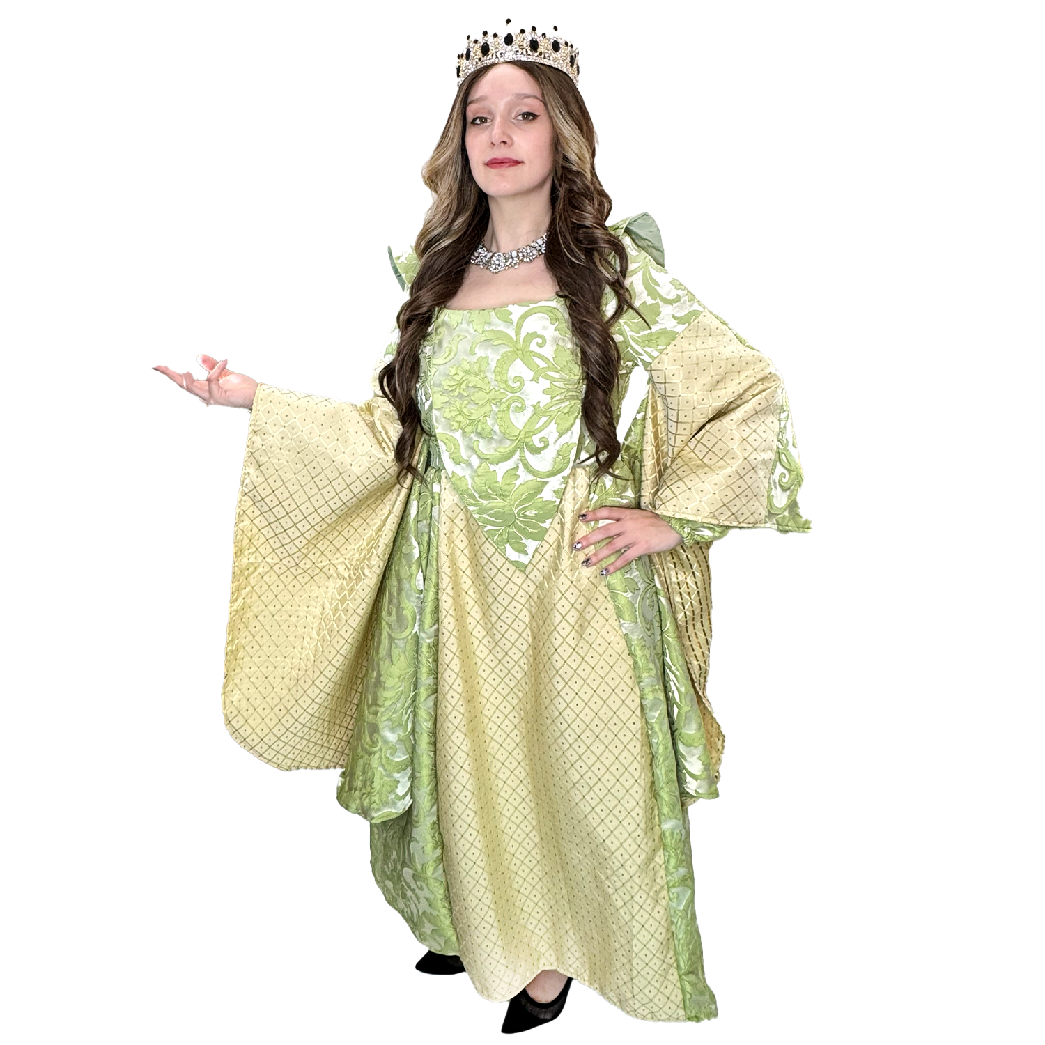 Step back in time with our Medieval Green and Gold Floral Queen Adult Costume. This royal ensemble includes a stunning dress with a beautiful floral print, perfect for any medieval-themed event. Rent or buy this costume in medium for a perfect fit. Don't forget to complete your look with our selection of crowns and accessories, available for separate purchase.