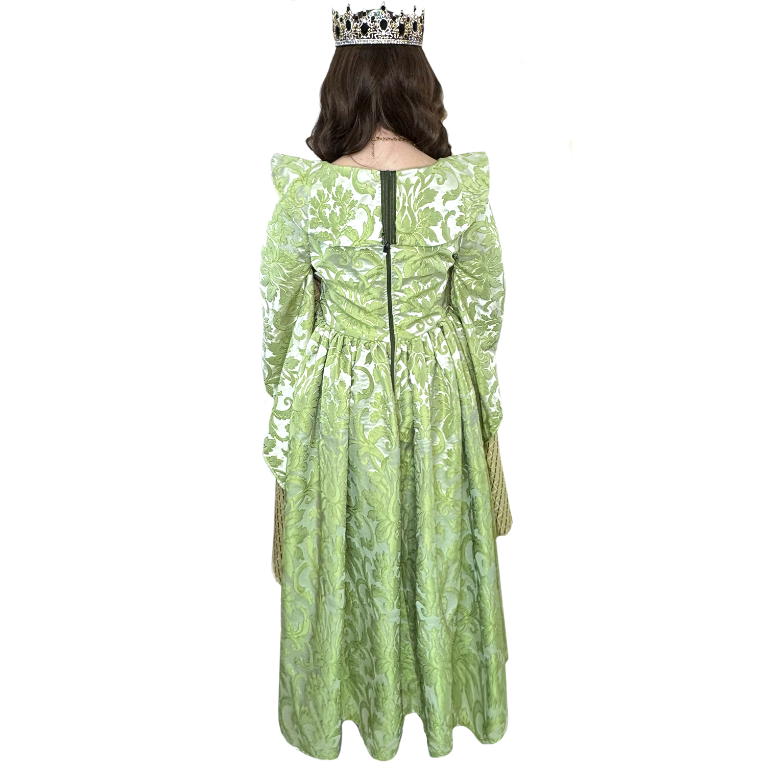 Step back in time with our Medieval Green and Gold Floral Queen Adult Costume. This royal ensemble includes a stunning dress with a beautiful floral print, perfect for any medieval-themed event. Rent or buy this costume in medium for a perfect fit. Don't forget to complete your look with our selection of crowns and accessories, available for separate purchase.