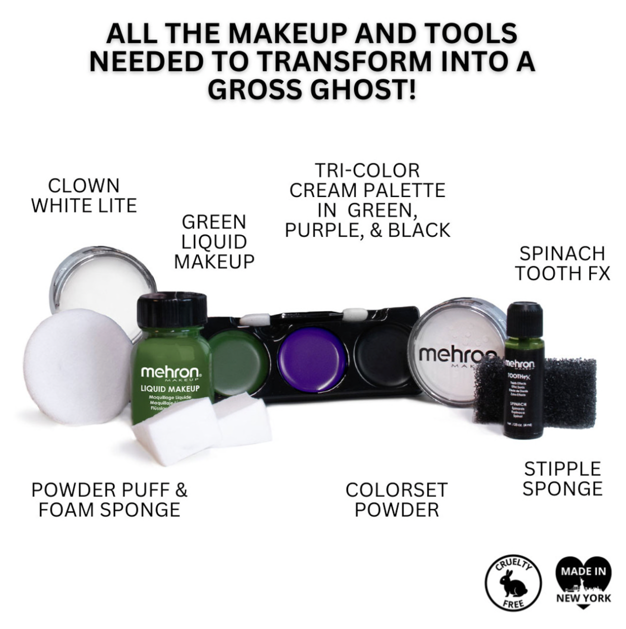 Turn into the recently deceased with Mehron’s Gross Ghost Professional Makeup Kit! Valued over $40.00, this complete kit includes all the makeup and tools necessary to transform into the ghost with the most. Whether you're a makeup novice or a seasoned artist, this kit comes with a visual step-by-step instruction booklet crafted by our professional makeup artists to guide you through the process.