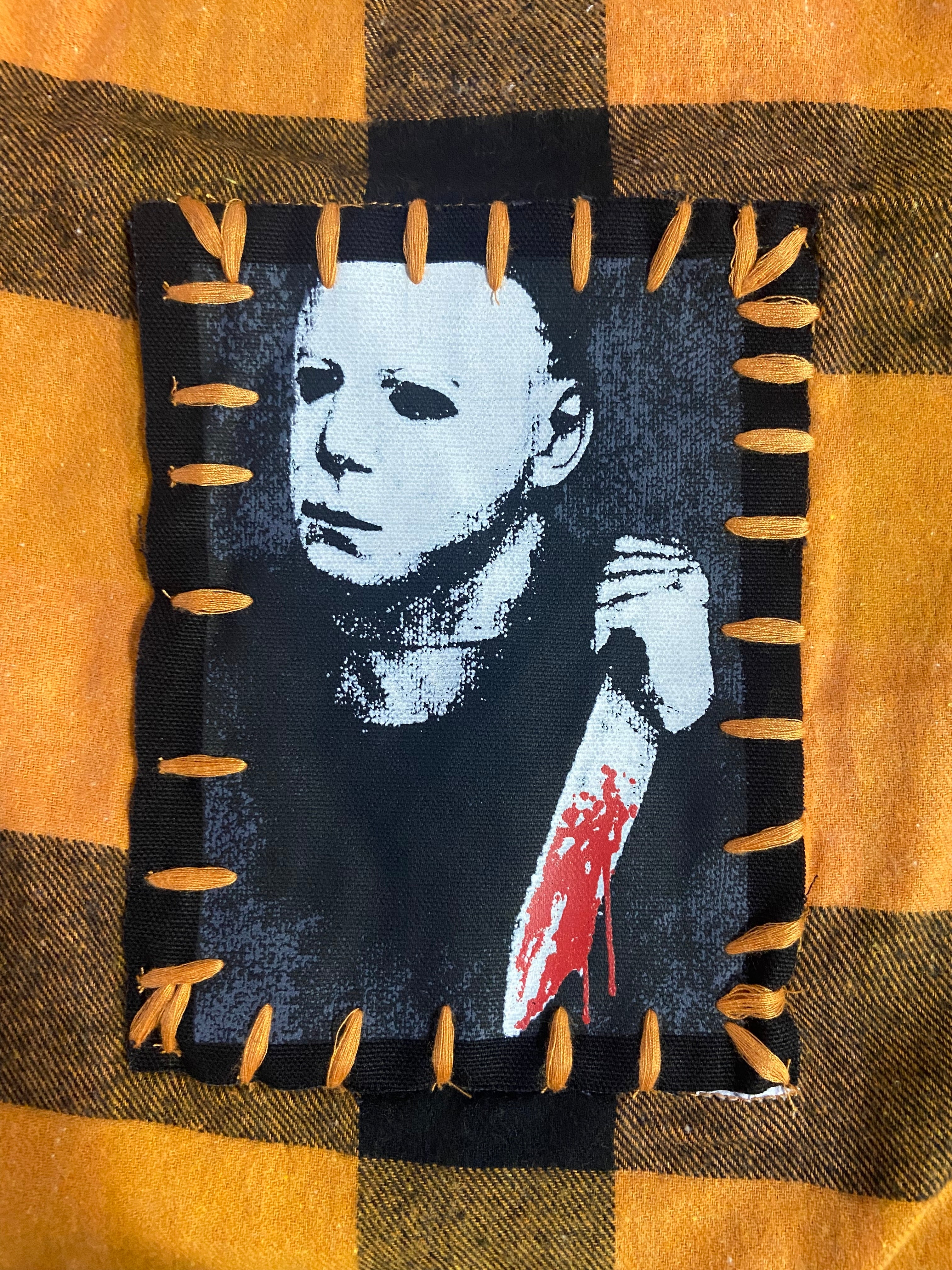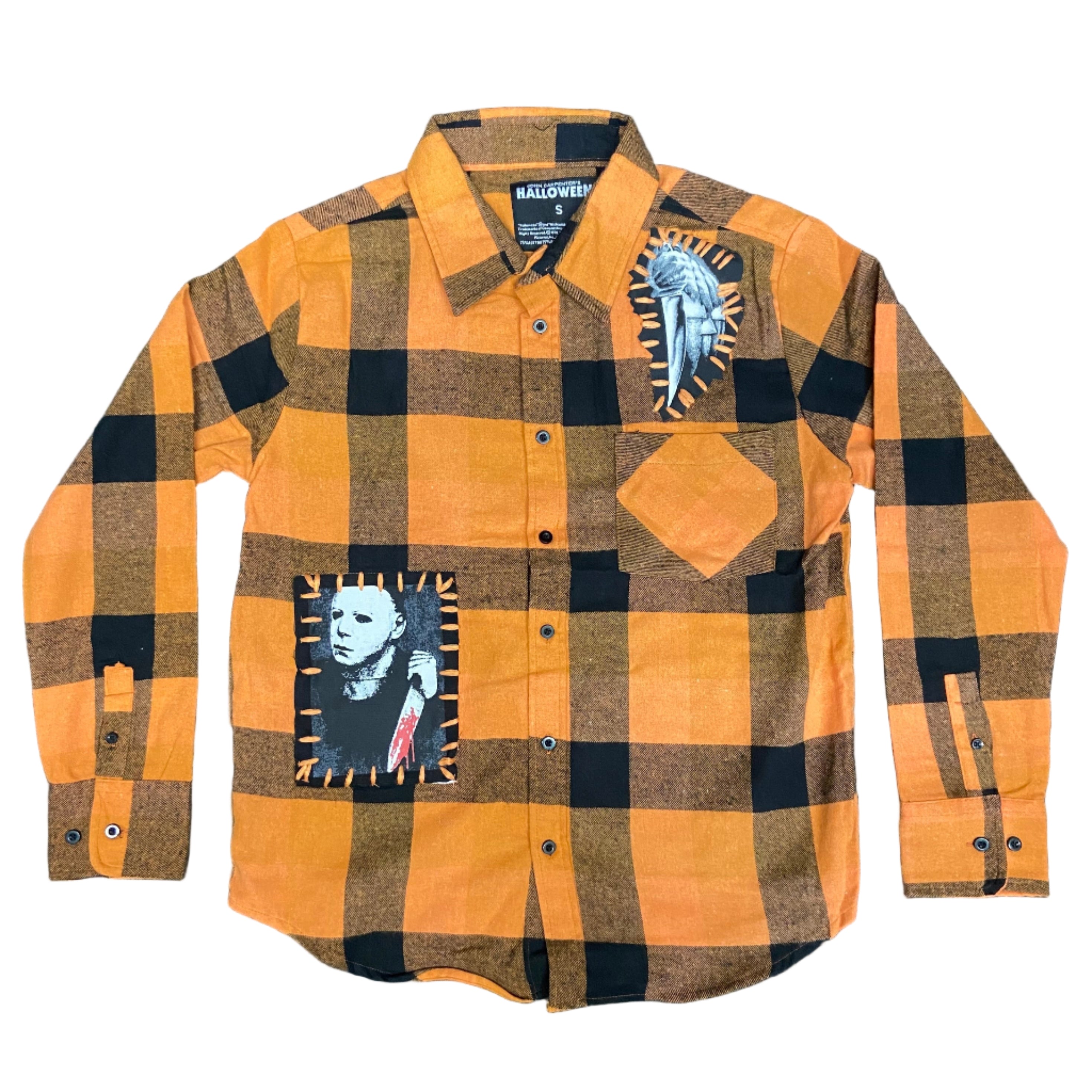 Upgrade your wardrobe with this high-quality Michael Myers flannel, featuring unique hand-stitched patches. Made for comfort and style, this flannel is perfect for any fan of the iconic horror franchise. Add an authentic touch to your outfit with this must-have piece.