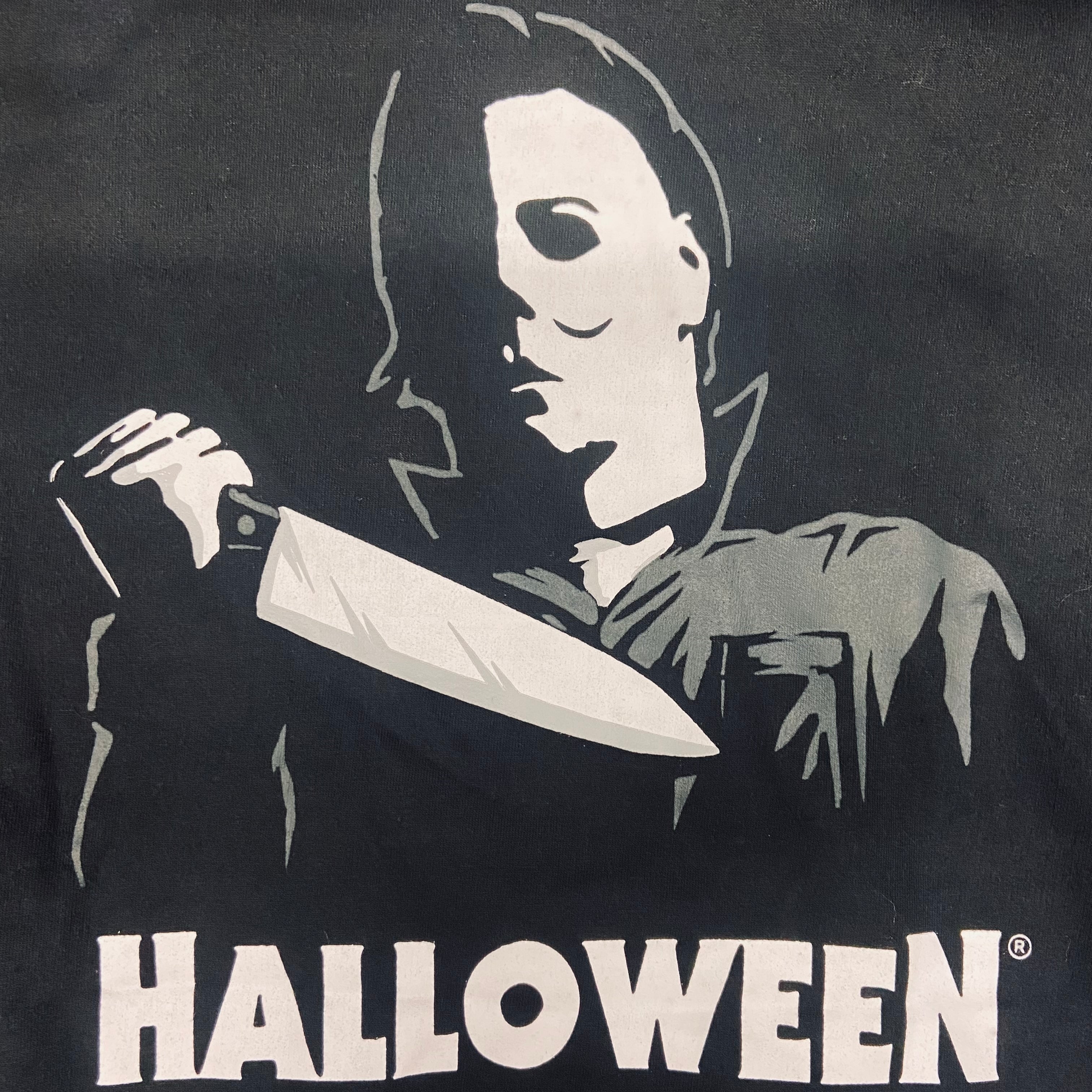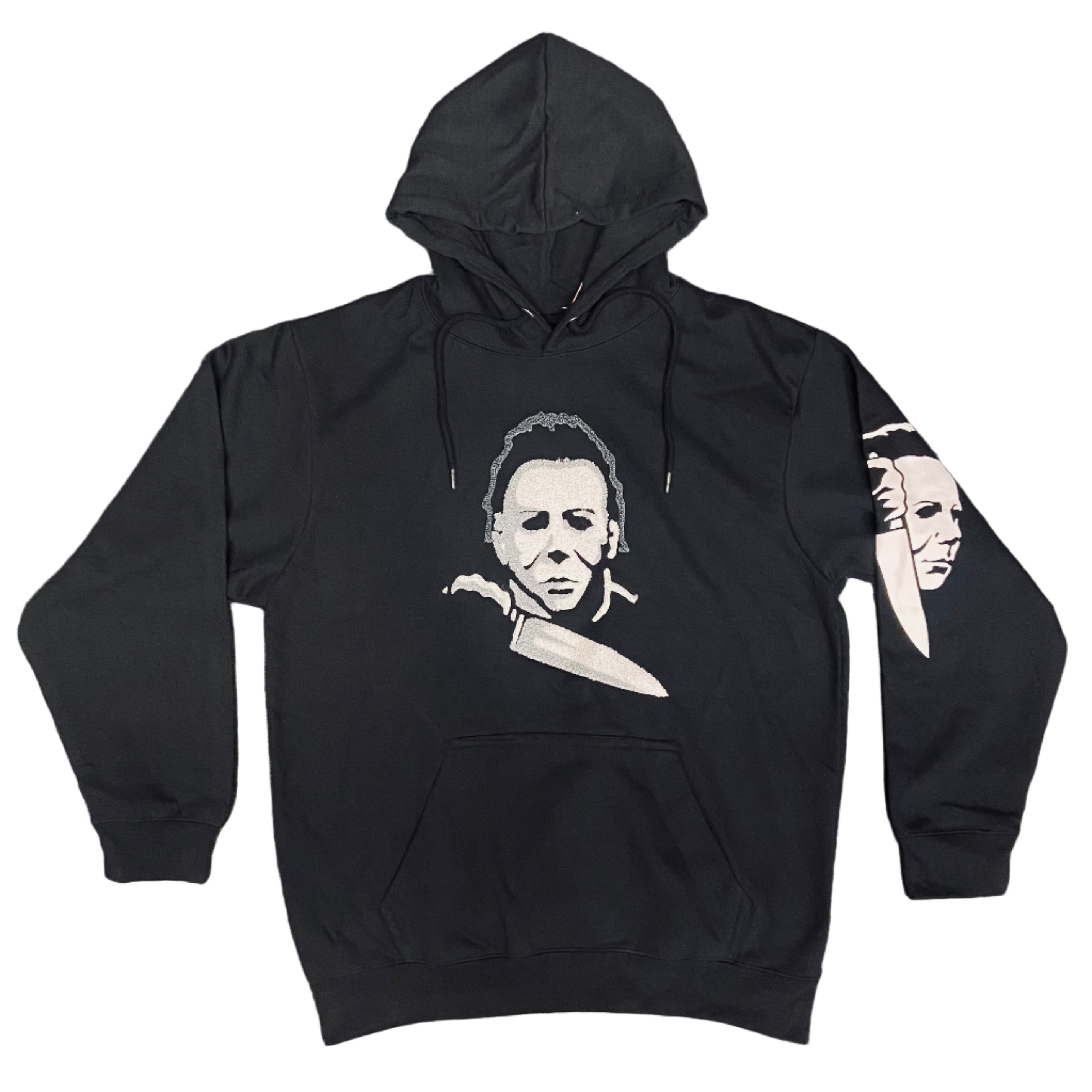 This Michael Myers Pull Over Hoodie features a chenille patch on the chest and a screen print on the sleeve and back. Stay warm and stylish with this high-quality hoodie, perfect for any fan of the iconic Halloween franchise. Made from durable materials, this hoodie is sure to be a new favorite in your wardrobe.