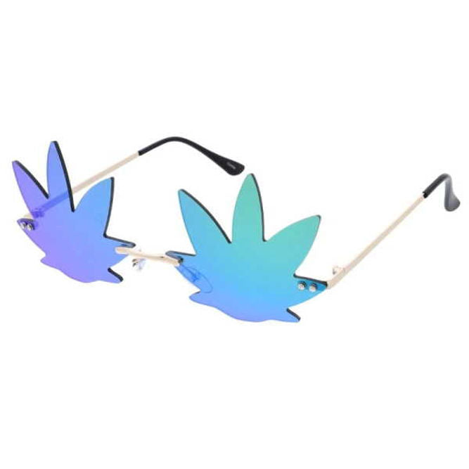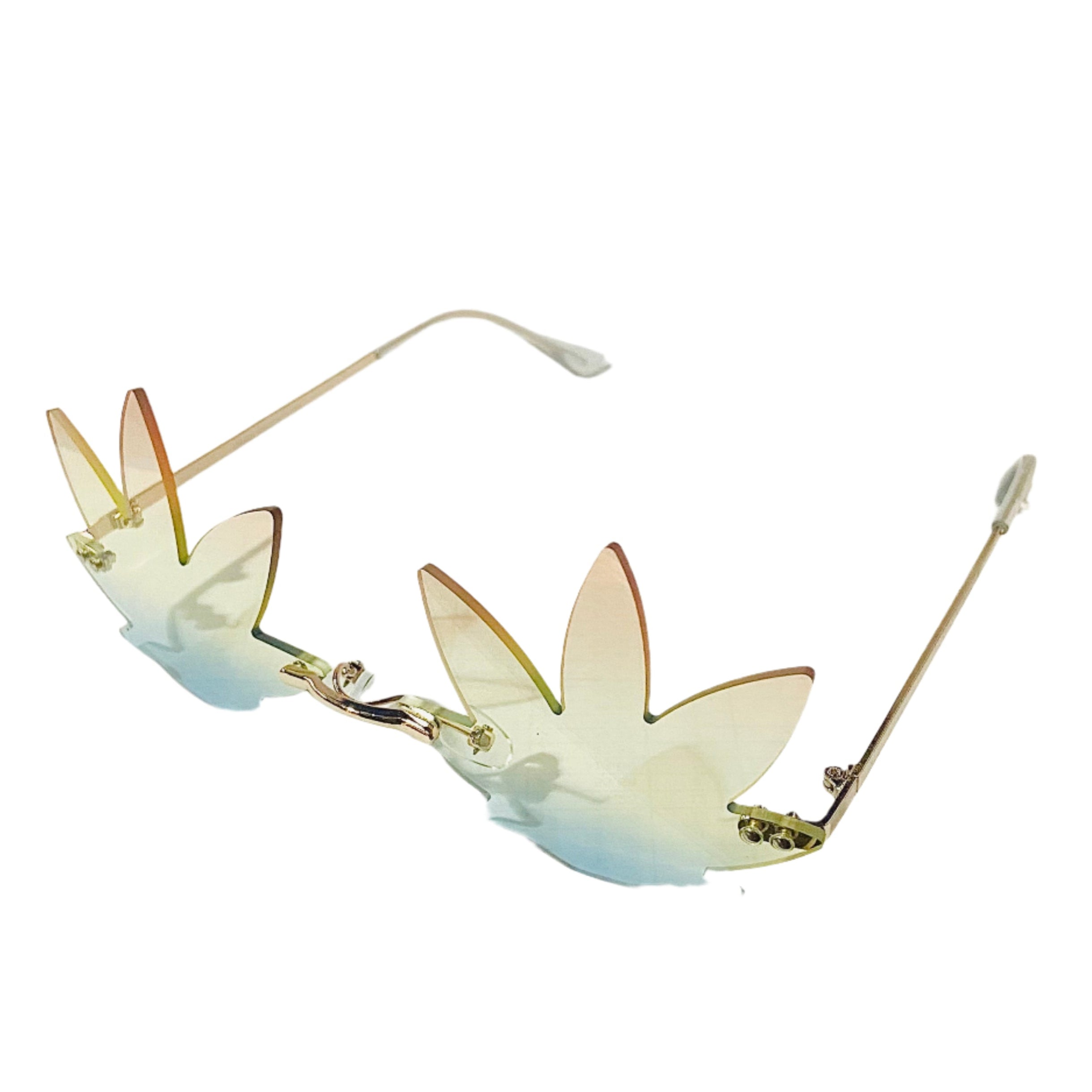 - Gold wire rubber tipped temples with frameless marijuana leaf lenses