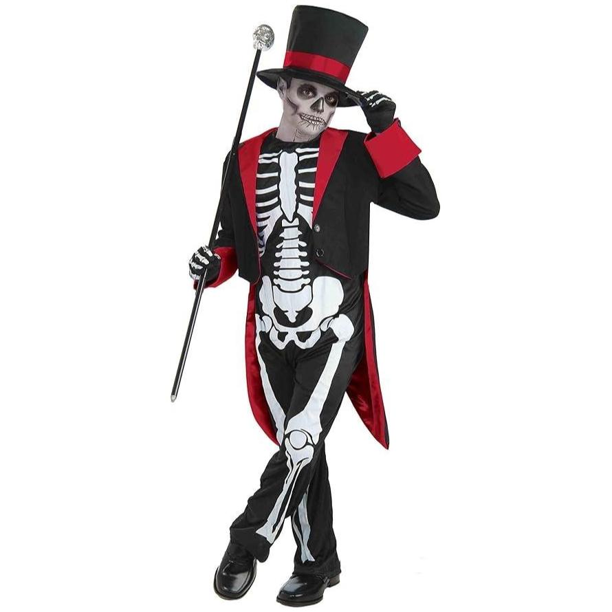 Transform your child into a spooky and stylish skeleton with Mr. Bone Jangles Skeleton Child Costume. This costume features a black top hat with a red ribbon, a sleek black jacket with red accents, and a black jumpsuit adorned with a white skeleton design. Perfect for Halloween or dress-up, this costume will have your child ready to dance (or rattle) their bones!