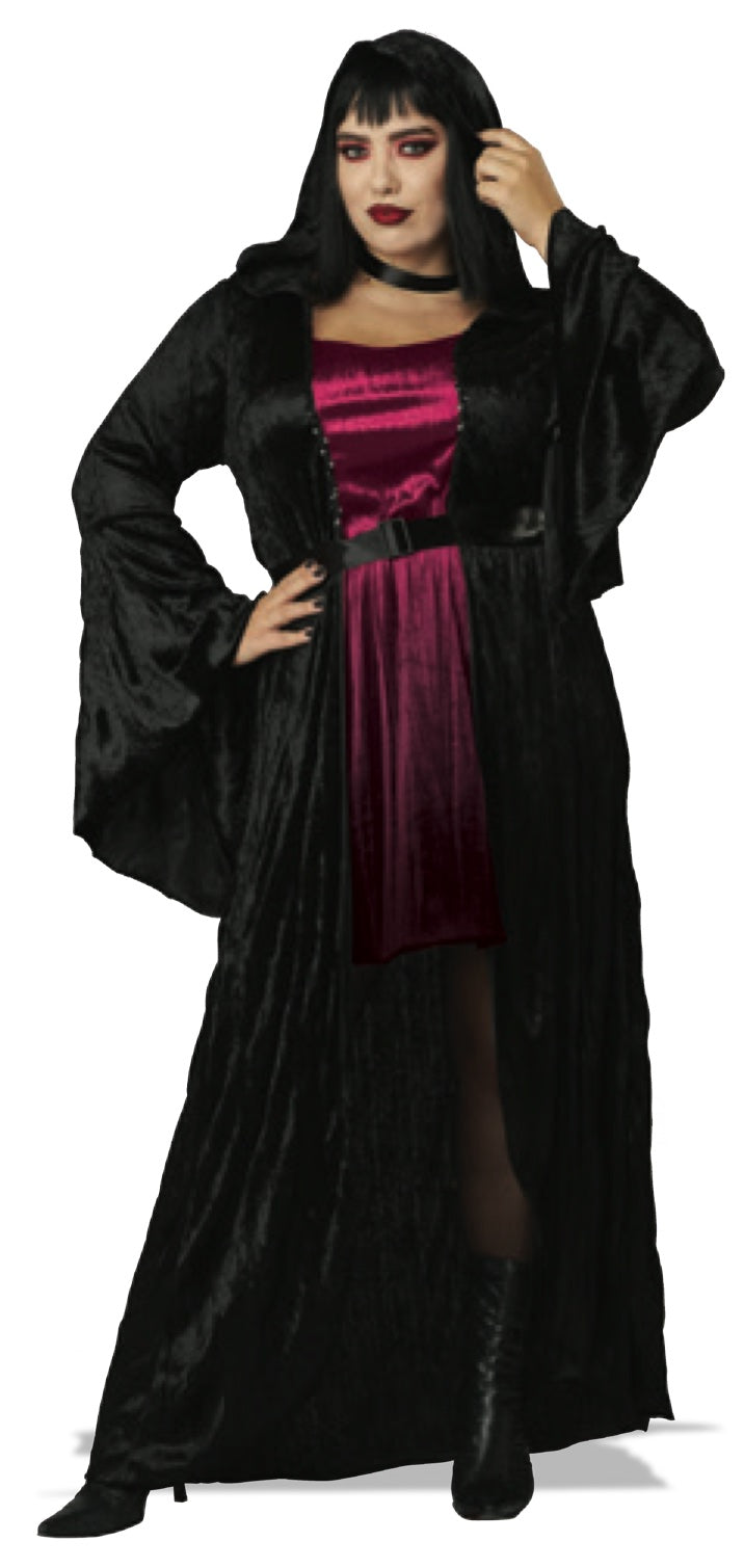 Become one with the shadows in this elegant Mysterious Hooded Vampire Costume! This black velvet dress features a sexy burgundy satin front panel and an accentuating ribbon choker for a dark, dreamy look that's perfect for channeling vampires, witches, or evil queens.