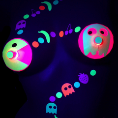 Get ready to light up the party with Pac Man LED Pasties! These unique accessories are a real crowd pleaser, with the ability to turn them on and off by simply twisting the nipple. The multi-color LED lights shine through your clothes, making for a playful and eye-catching look. Plus, the hypoallergenic adhesive ensures a comfortable and secure fit. Batteries are included and the fast flashing LED's add an extra fun touch. Get ready for a night of fun and games!