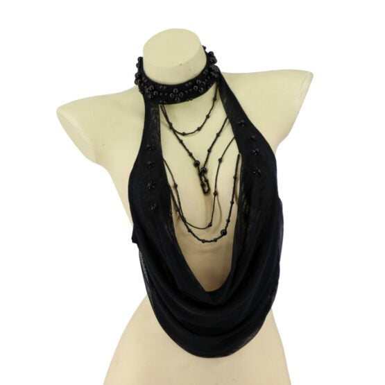 Turn heads at every rave and festival with this Pearl High Neck Halter Top in Black. Its gothic-inspired design adds an edgy vibe, while the one-size-fits-most cut ensures a comfortable, flattering fit. Perfect for dancing all night or making a bold statement, this top blends style and attitude effortlessly.