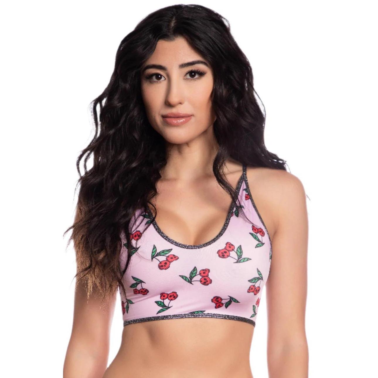 Unleash your playful side with this Pink Cherry Skull Pattern Tank Top! Featuring a flirty scoop neckline and back, this spaghetti strap crop top showcases an eye-catching skull cherries design on a pink background with edgy black twinkle trim. One size fits most. Complete your rebelliously cute look by pairing with matching shorts, sold separately.