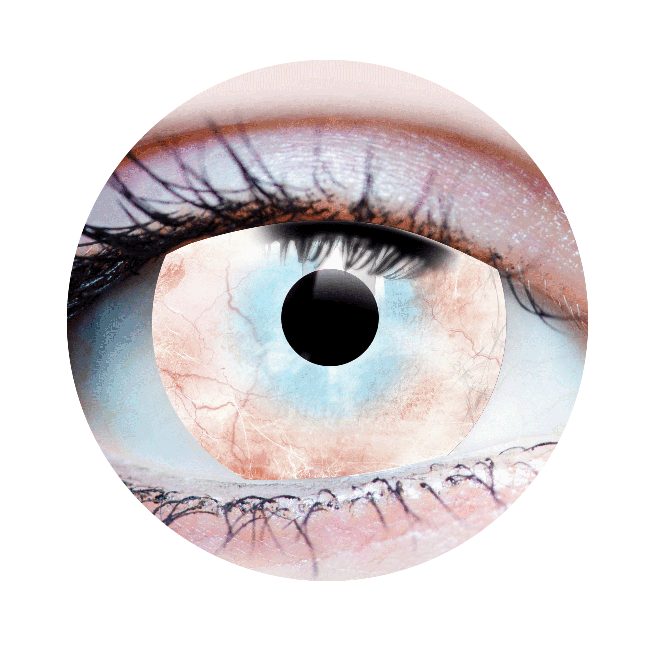 PLAGUE features an opaque zombie eye effect with light blue rim contouring the pupil and pale blood with veins on the outer rim. Gives the effect of an infected eye, perfect for creating an undead character, demon or monster.
