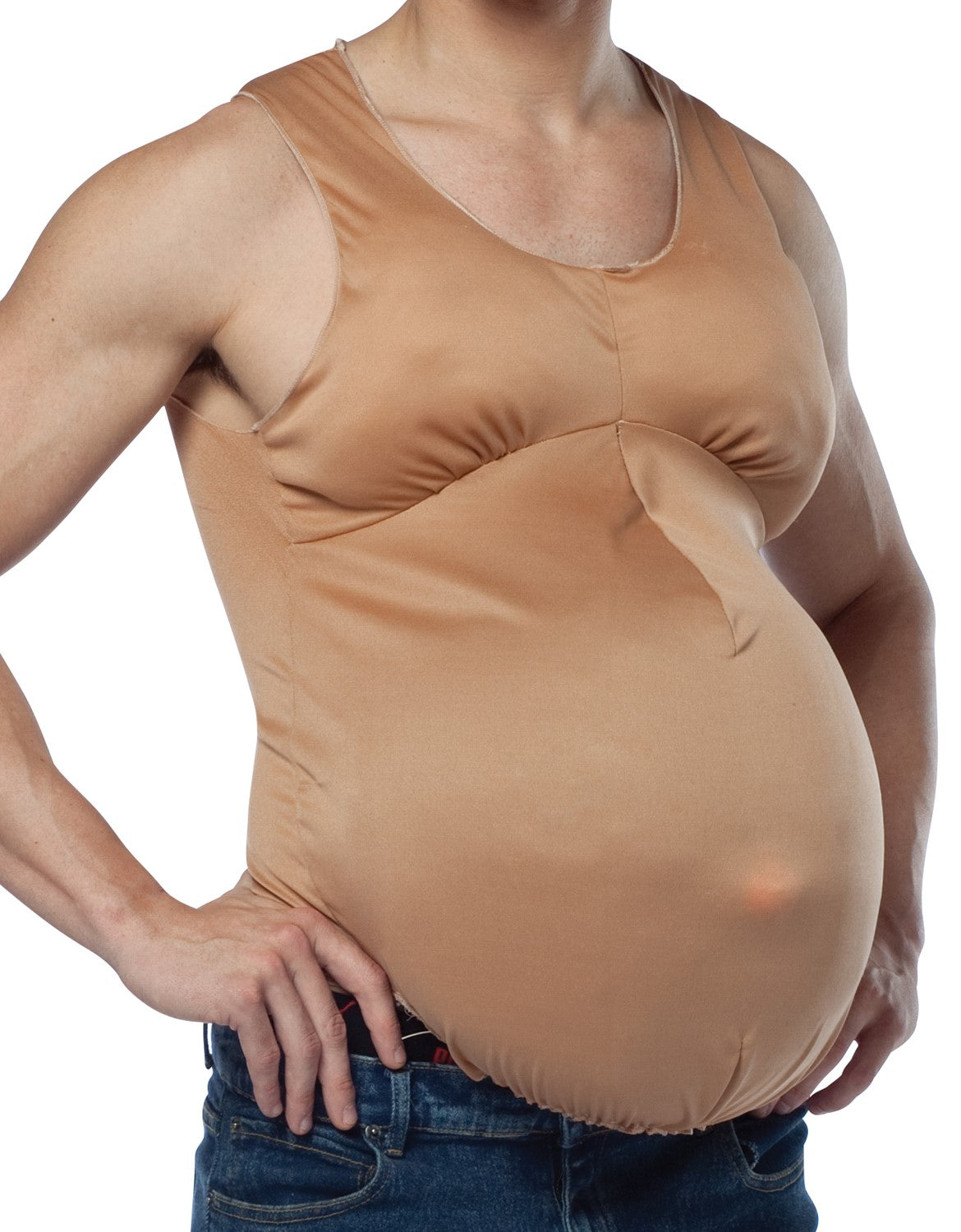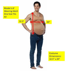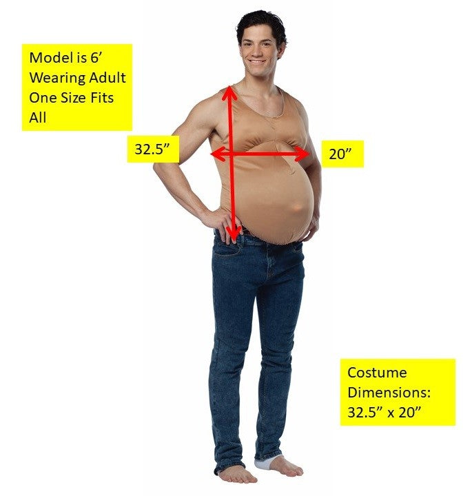 The fake pregnant belly is a hilarious addition to any Halloween costume. Get creative! Pregnant cheerleader, nun, red neck, school girl, or prom queen? They are all funny with a bun in the oven! The adult pregnant belly costume includes a nude polyester bodysuit with enlarged belly button and belly. This easy to wear adult humor Halloween costume accessory is great for theatrical productions, Halloween parties and husbands to see how it feels!