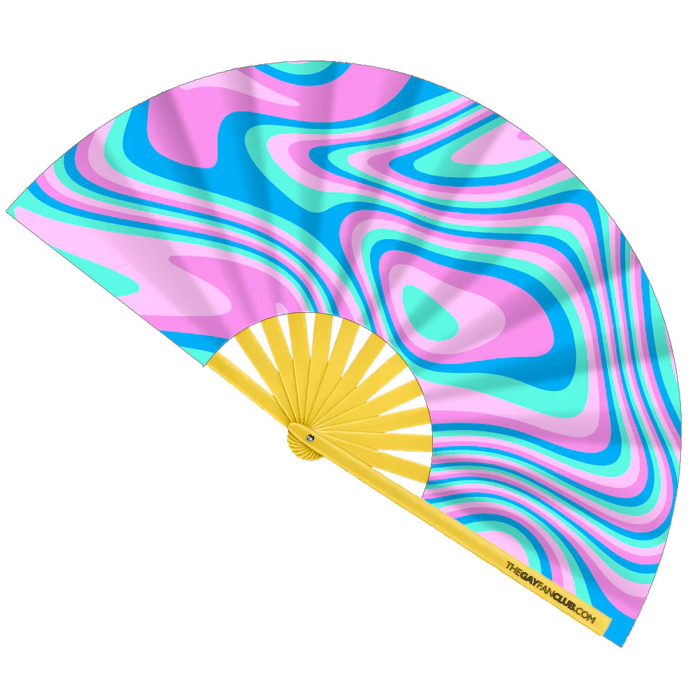 The Psychedelic Trans Fan is a vibrant pink and blue rave hand fan that blends swirling psychedelic patterns with the iconic Trans Flag colors to create a visual statement that is both bold and beautiful.