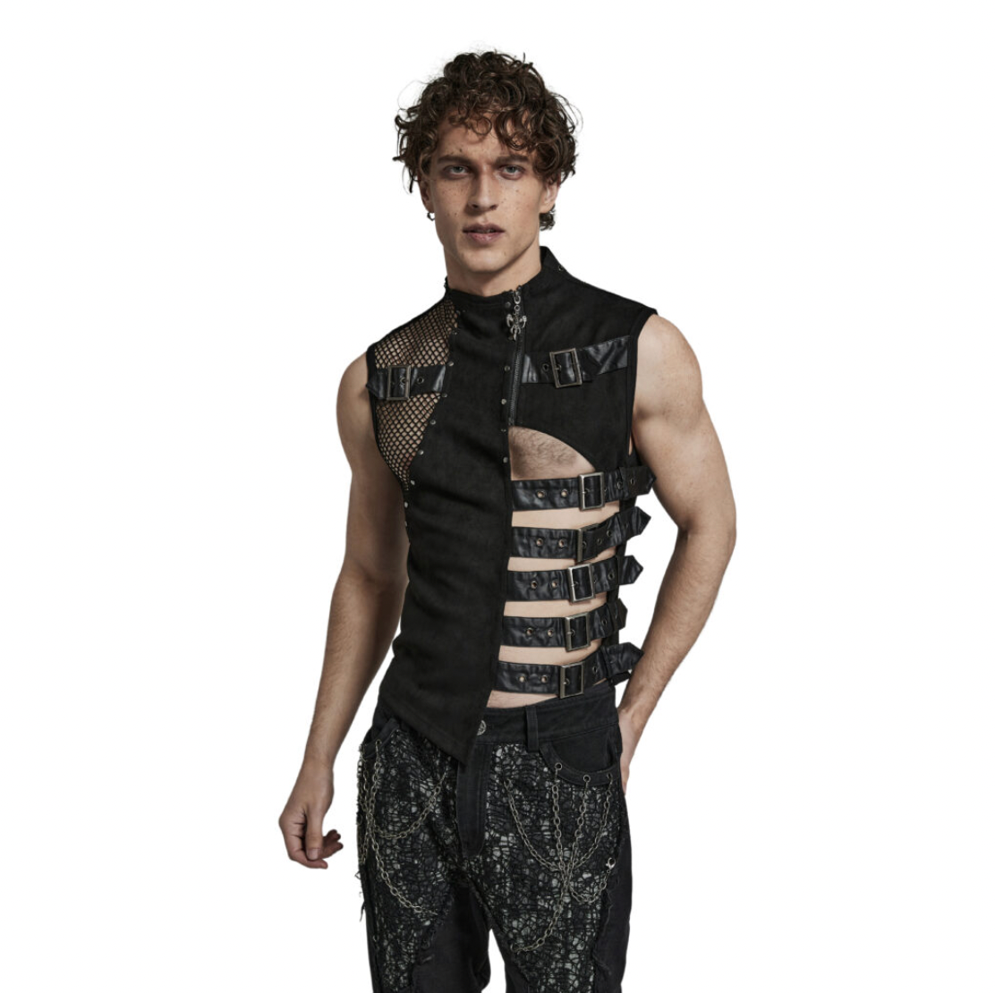Become the protagonist of your own cyberpunk thriller (or antagonist, we don't judge!) with this industrial chic Side Buckle Suede Vest. This sexy suede top features an open cutout buckle design and mesh accents that'll instantly elevate your goth, punk, visual kei, dieselpunk, or post-apocalyptic inspired outfit. Great for costumes, festivals, raves, and photoshoots!