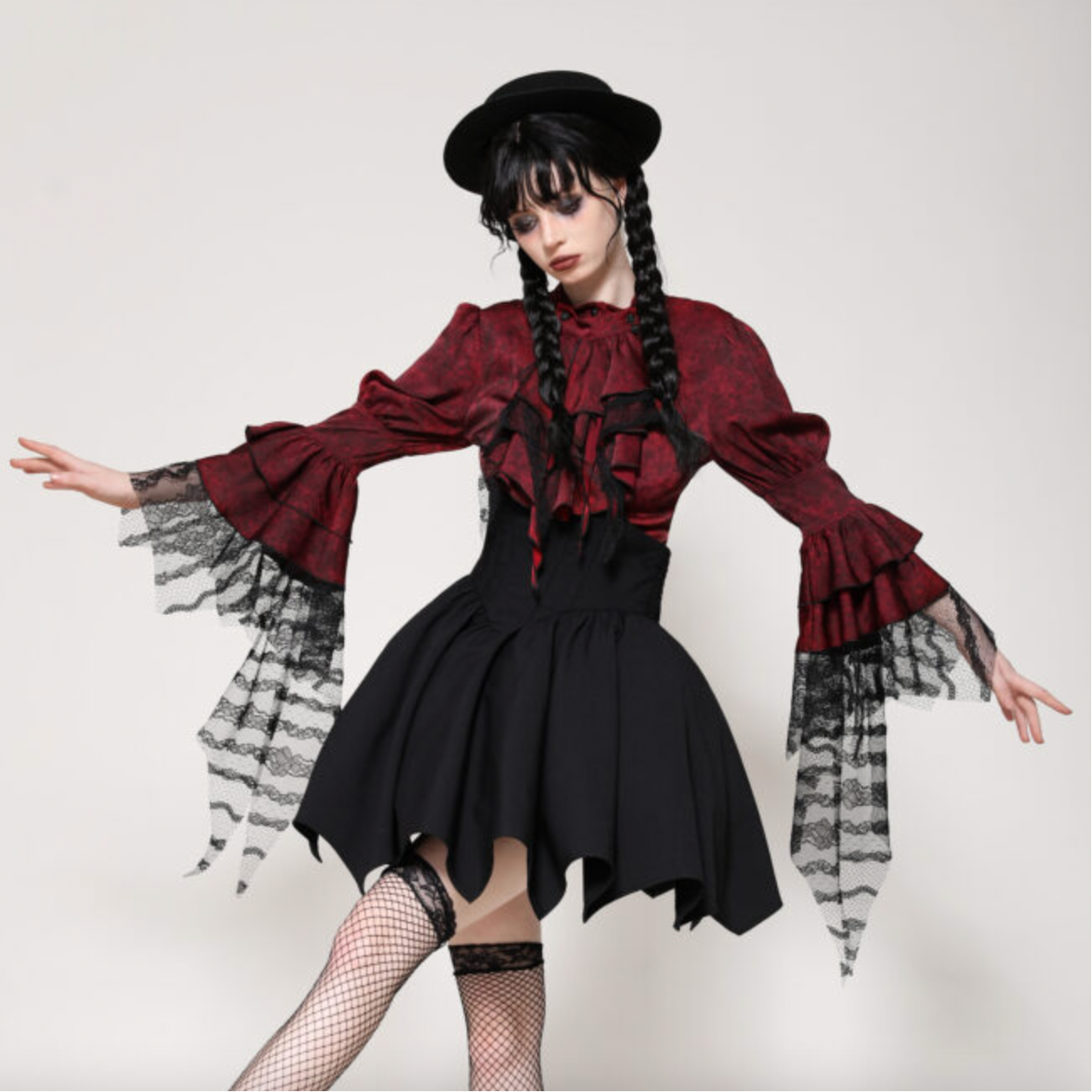 Embrace your dark side with this red distressed frill blouse, featuring dramatic bell sleeves and delicate lace accents that perfectly blend goth, vampire, and steampunk vibes. Available in small, medium, and large, it’s designed to add a playful yet mysterious flair to your wardrobe. Perfect for those who love to stand out with a touch of vintage edge and romantic darkness.