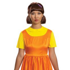 Dress up as the iconic giant creepy doll from Netflix's hit series Squid Game with the Red Light/Green Light Young-Hee Doll Deluxe Adult Costume. This licensed costume includes a dress, wig, and socks for a complete transformation. Perfect for costume parties or Halloween (or your next watch party!)
