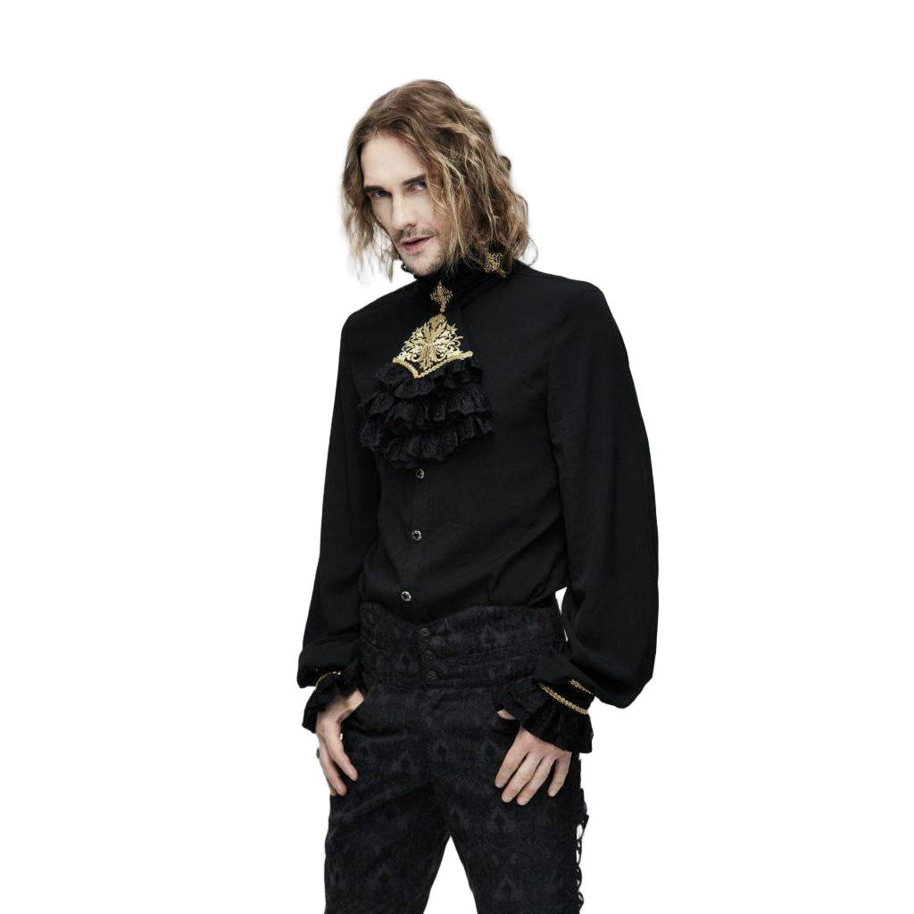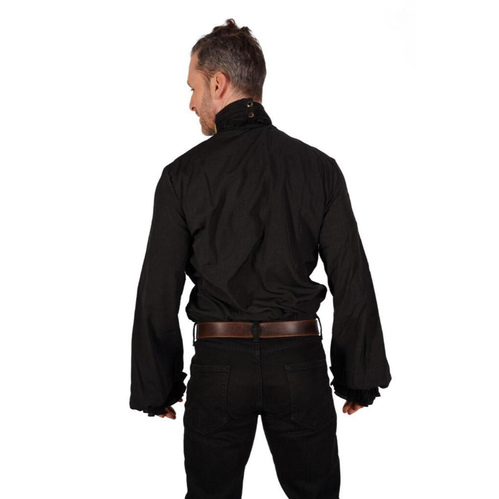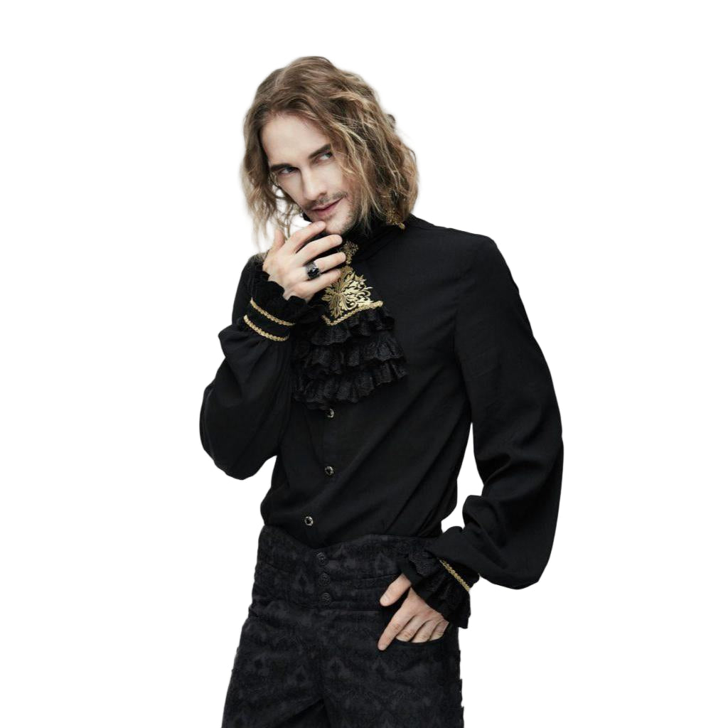 Elevate your renaissance or gothic-inspired wardrobe with this black pirate shirt, featuring elegant gold accents and delicate ruffles. Crafted from high-end, lightweight material, it offers both comfort and style for events or daily wear. Perfect for those seeking a bold, authentic look with a refined touch.