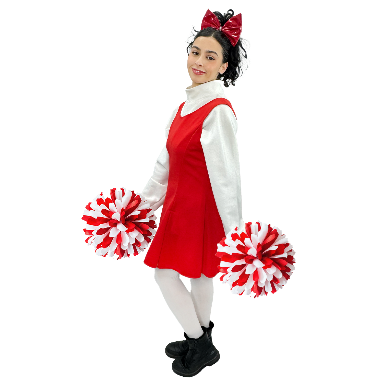 This retro cheerleader costume exudes vintage charm with its red dress, white turtleneck, red shorts, and red bow. Perfect for sporting events or themed parties, it's available to rent or buy in size small. Elevate your look with additional accessories, conveniently available for purchase online or in-store.