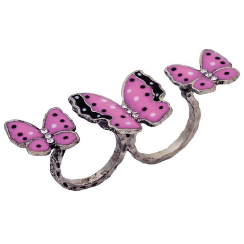 Add a sparkling touch of 90s rave energy with this Rhinestone 3 Butterfly double ring. Featuring three shimmering butterflies, it brings kawaii charm and playful sparkle to your look. Perfect for dancing the night away or adding a fun, retro vibe to any outfit.
