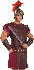 You'll be looking battle-ready for any Halloween party with this Roman Body Armor! This faux leather tunic features gold medallion embellishments and a distressed finish, excellent for any warrior themed cosplay or LARP outfit.
