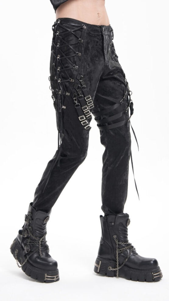 These shiny black punk pants combine bold style with adjustable comfort, featuring side lacing and buckles for a customized fit. Designed with a gothic edge, they offer a distinctive look that stands out while ensuring flexibility. Perfect for men seeking to express individuality through fashion without sacrificing functionality.