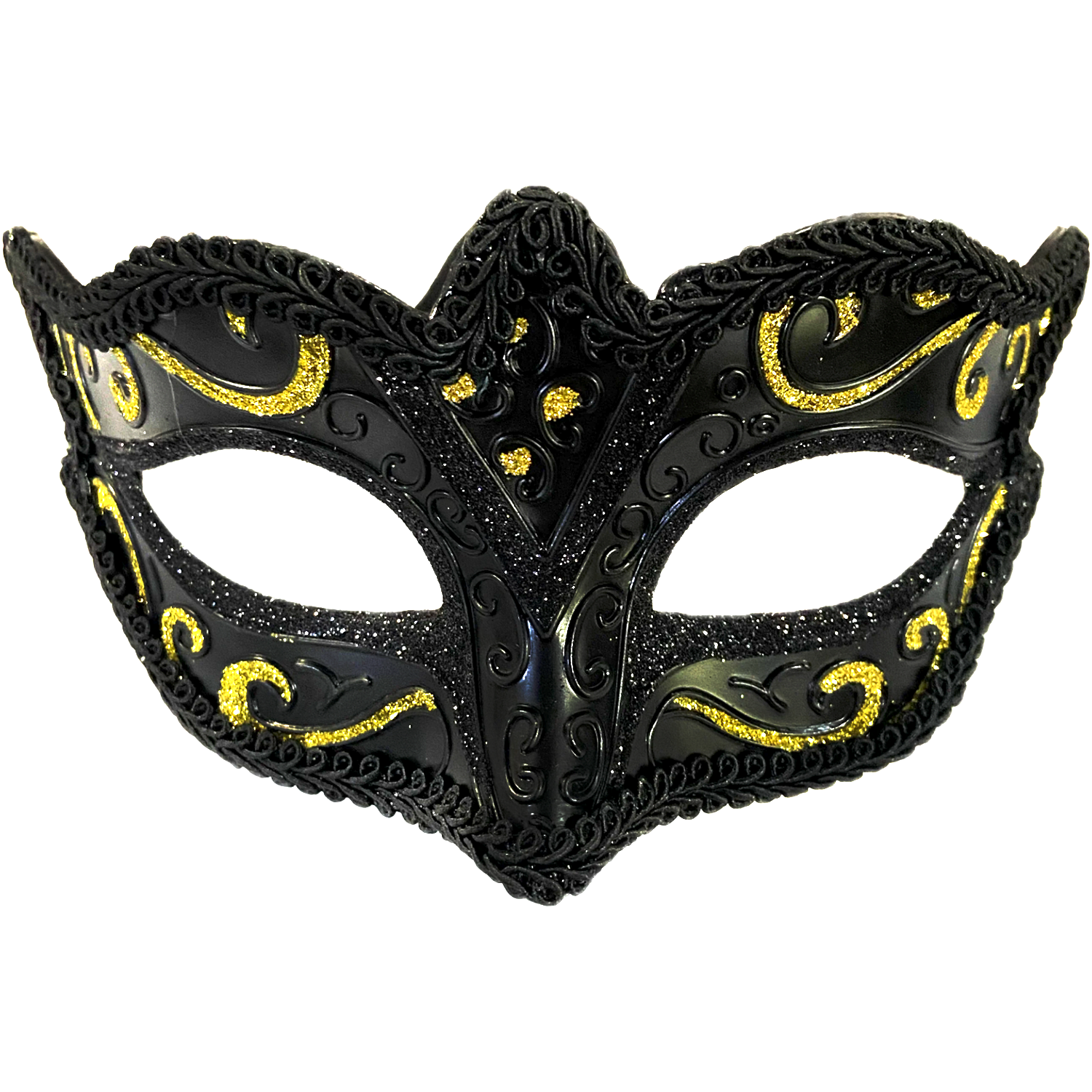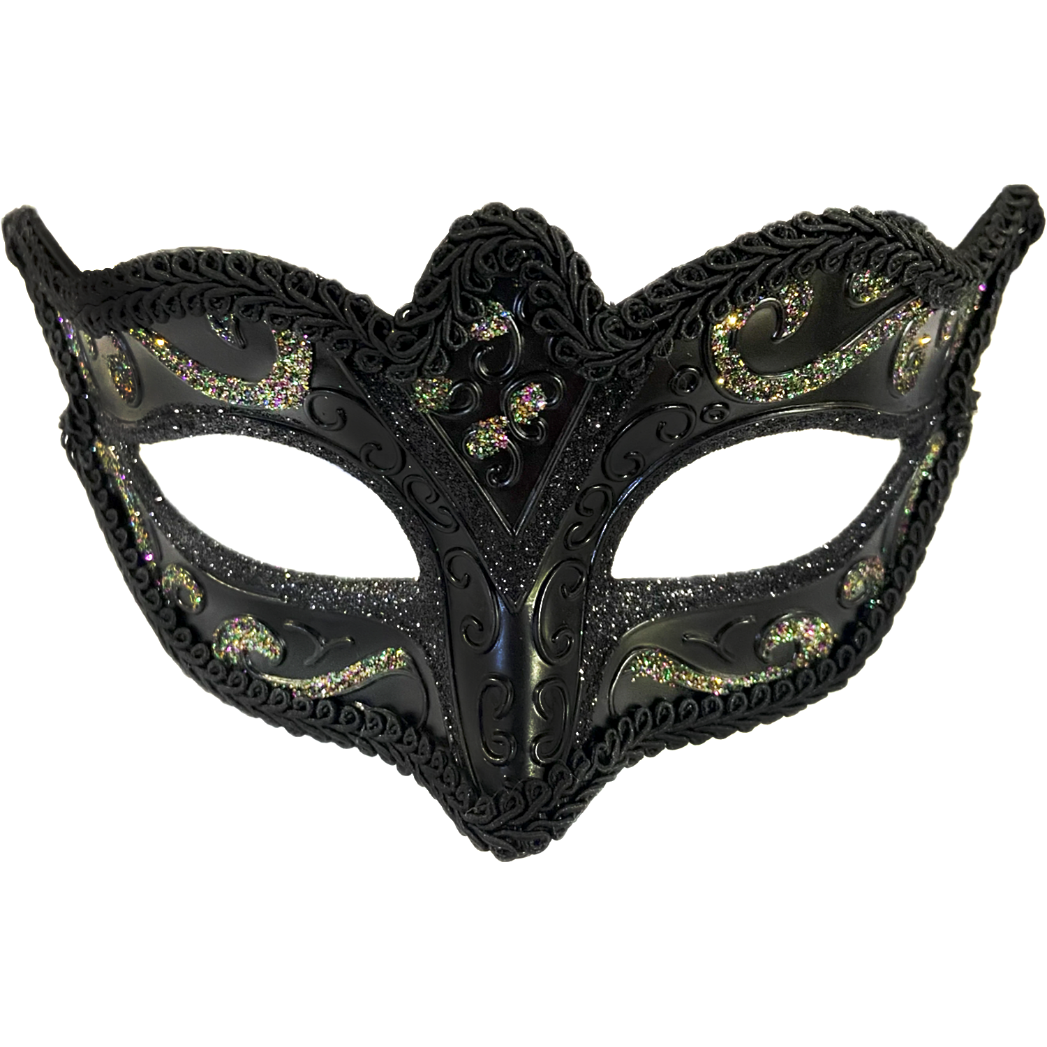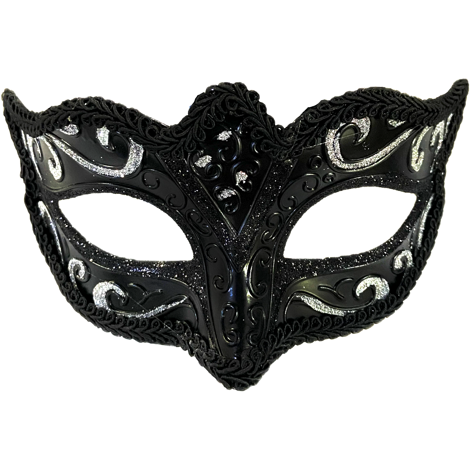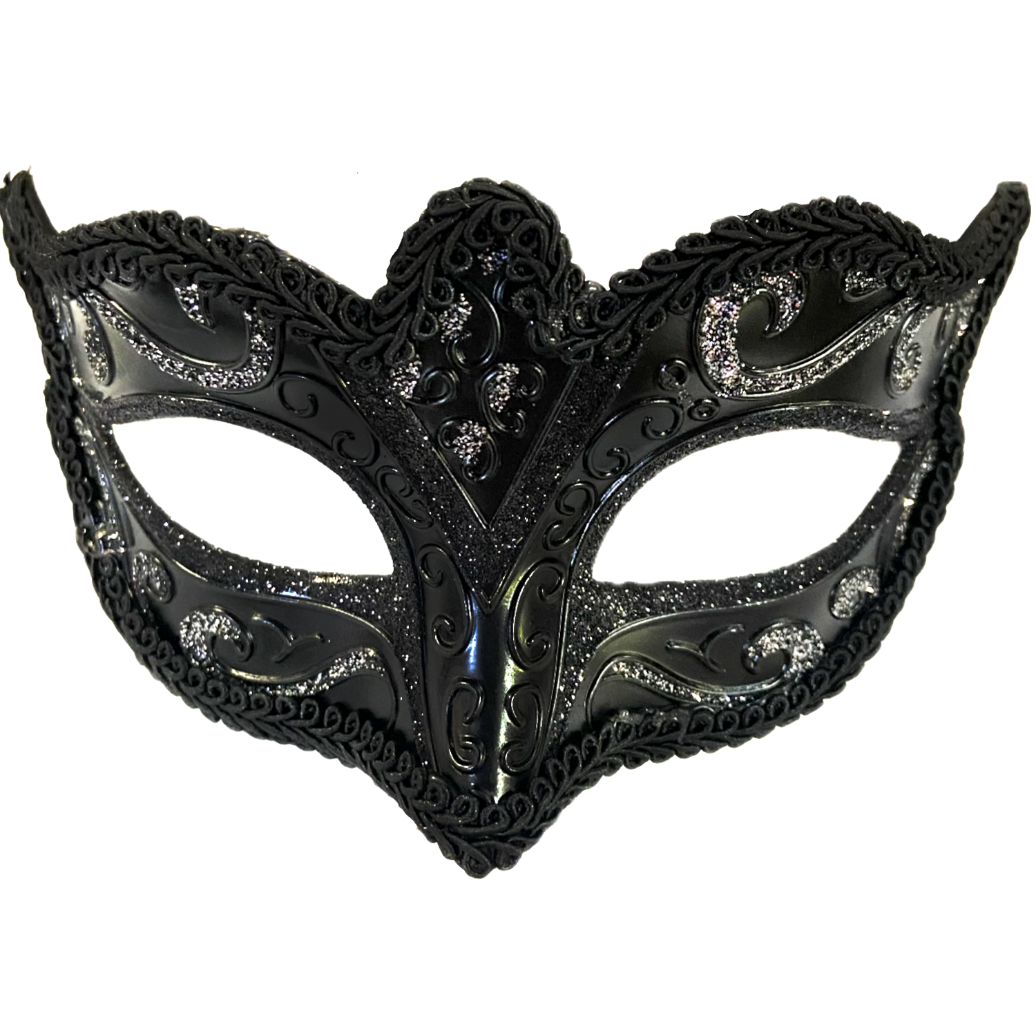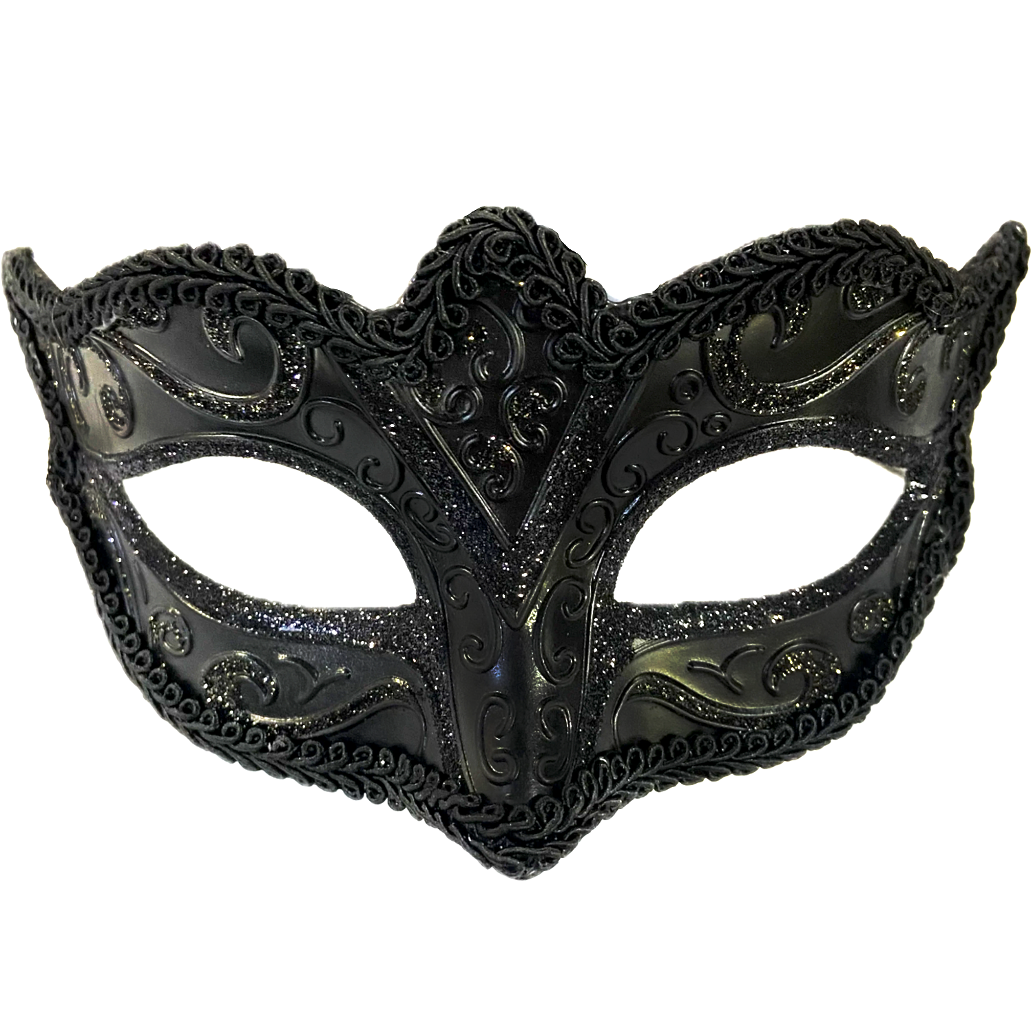 Introducing the Juliet Black Glitter Masquerade Mask. Made with high-quality materials, this mask is perfect for any masquerade event. The combination of black and glitter adds a touch of elegance and mystery to your look. Get ready to turn heads and make a statement with this stunning mask.