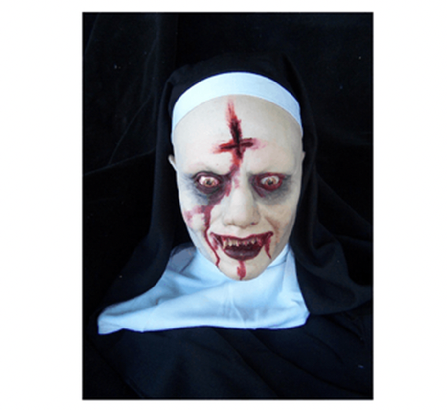 Your prayers won't do her any good, but you may want to say a couple anyway! This creepy Sister DeMonica Head Prop is a life-size rendering of a possessed nun head with sharpened teeth and a bloody cross shaped forehead gash, complete with a habit. Perfect for Halloween decoration and church-themed haunts!