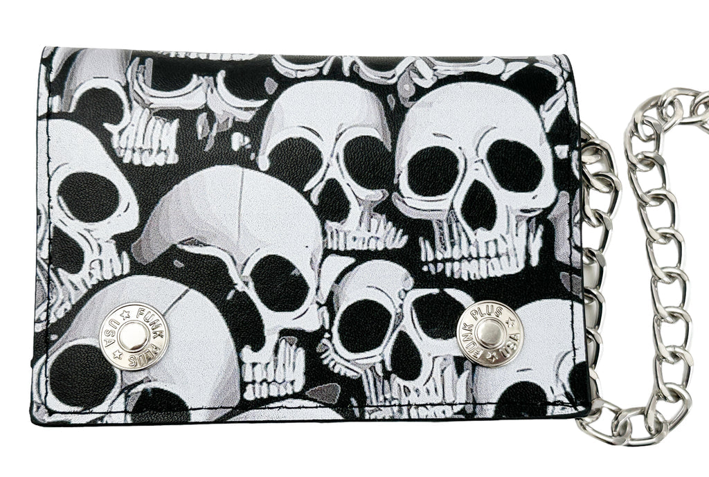 Nothing says "memento money" like this Skullz Print Leather Wallet! That's the expression, right? This trifold chain wallet is made with genuine black leather decorated with an all over white skull print to remind one of the beautiful, fleeting nature of paychecks.