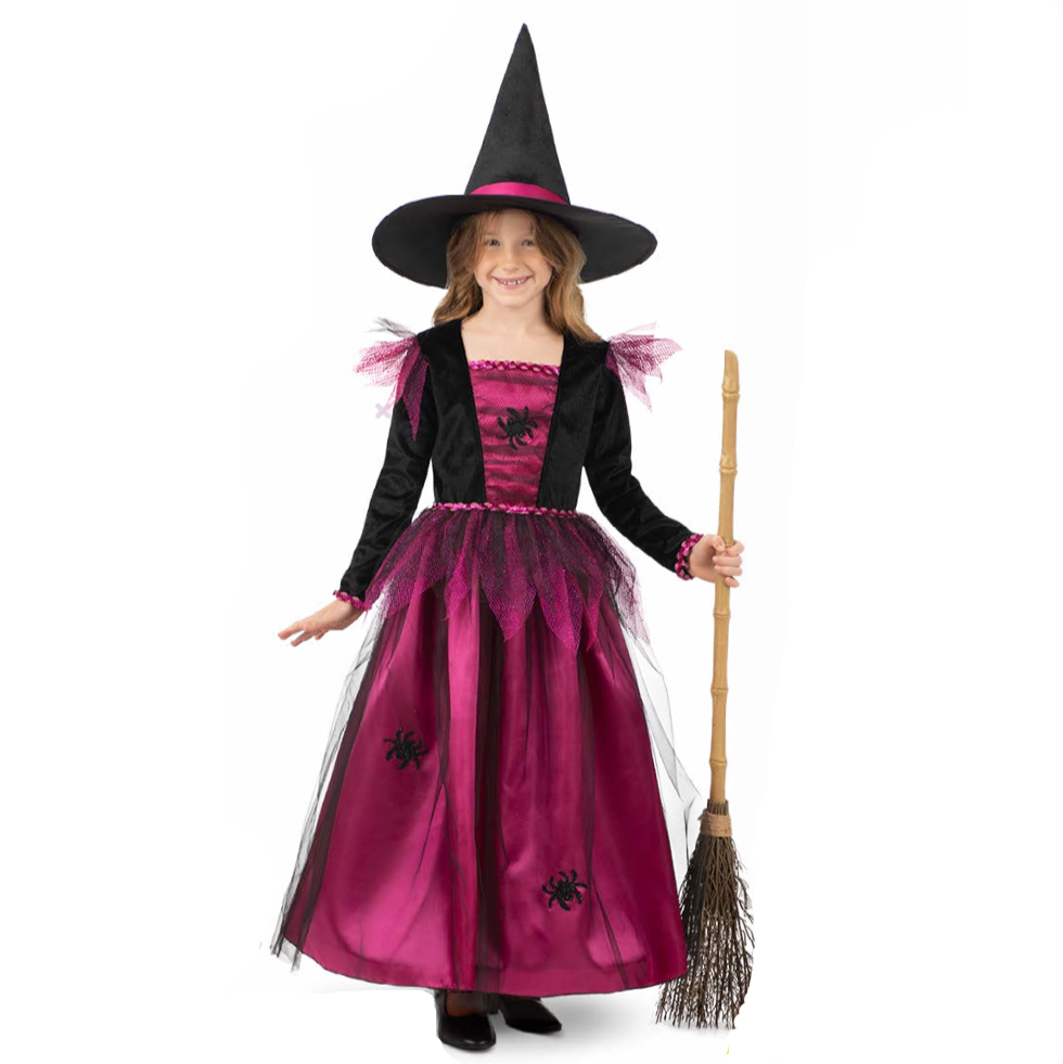 Transform your little one into a charming spellcaster! This Spider Witch Costume features a gorgeous magenta dress with spider pattern and matching witch hat that'll make for a bewitching Halloween look. BYO-broom, though.