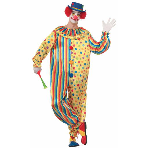 Go all in with this Spots The Clown Silly Adult Costume! It includes a zany jumpsuit with attached rainbow-striped and spotted collar, plus a set of colorful pom poms. Spread your craziness at your next costume party and let your inner clown shine! (Or is it Spots?)