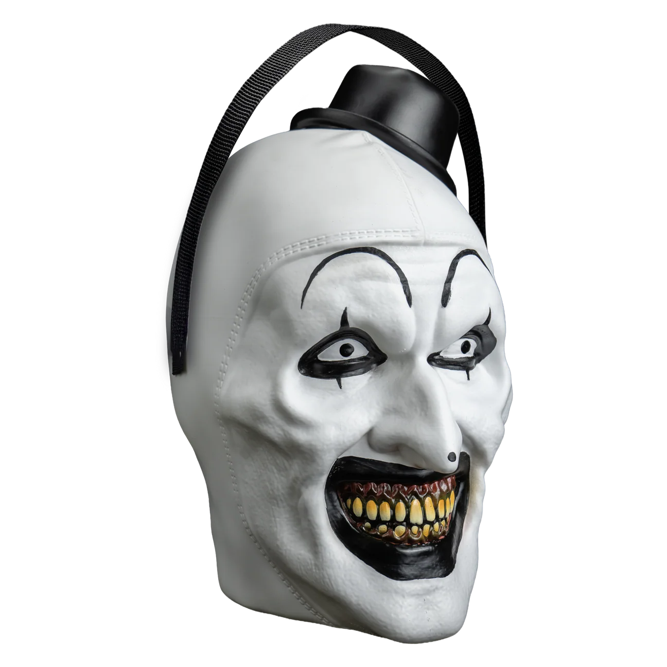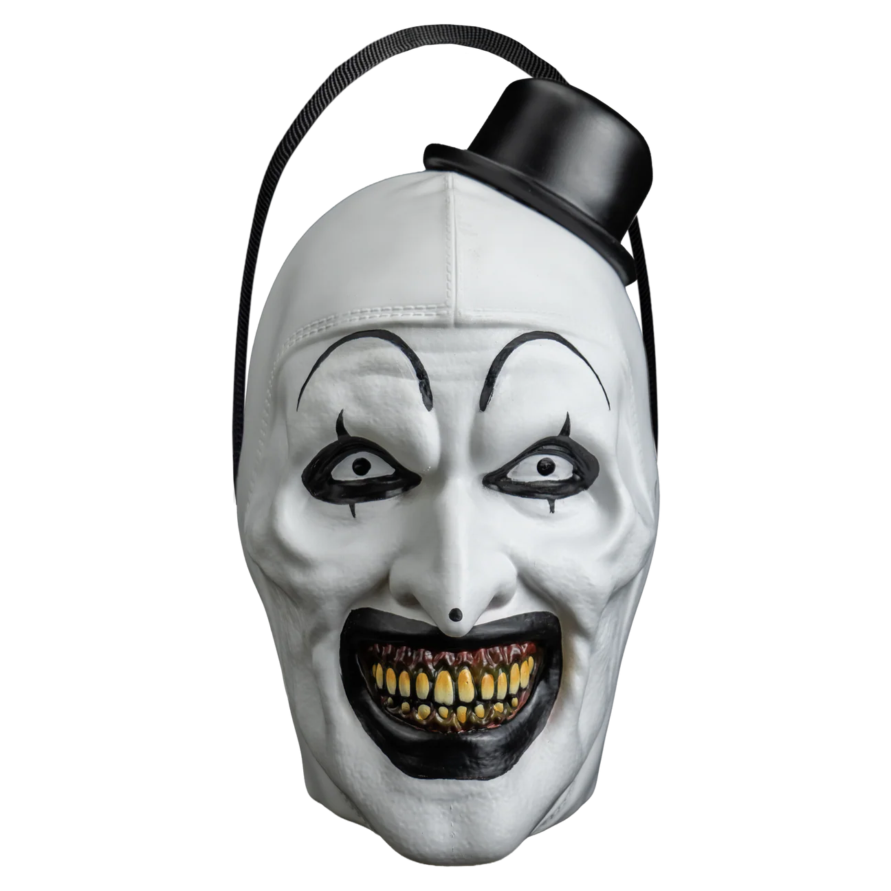 This Art The Clown Candy Pail features a sculpted Art the Clown head design with a flexible plastic handle and a removable hat lid that pops off to insert Halloween treats. For wrapped candy and display use only. Not suitable for direct food contact.
