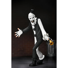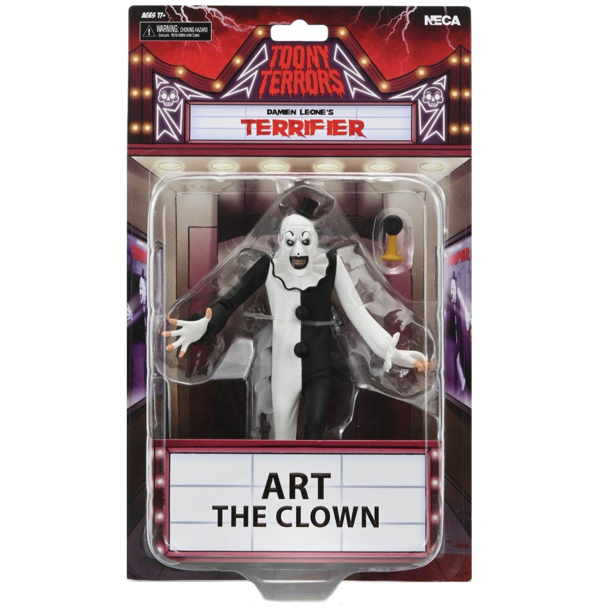 Art is decked out in his classic black-and-white harlequin suit and sinister grin, wielding his trusty clown horn—because even murderers need comic timing. Packaged in a classic blister card with a bonus cutout backdrop, this version of Art is equal parts terrifying and toony, making it a must-have for collectors who want a little mischief on their shelf.