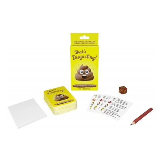 The hilarious party game where you and your friends attempt to out gross each other. Ham it up by doing overacted impersonations, name items that fit into vulgar categories, judge your friends in their efforts to gross each other out, and much, much more!!!