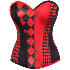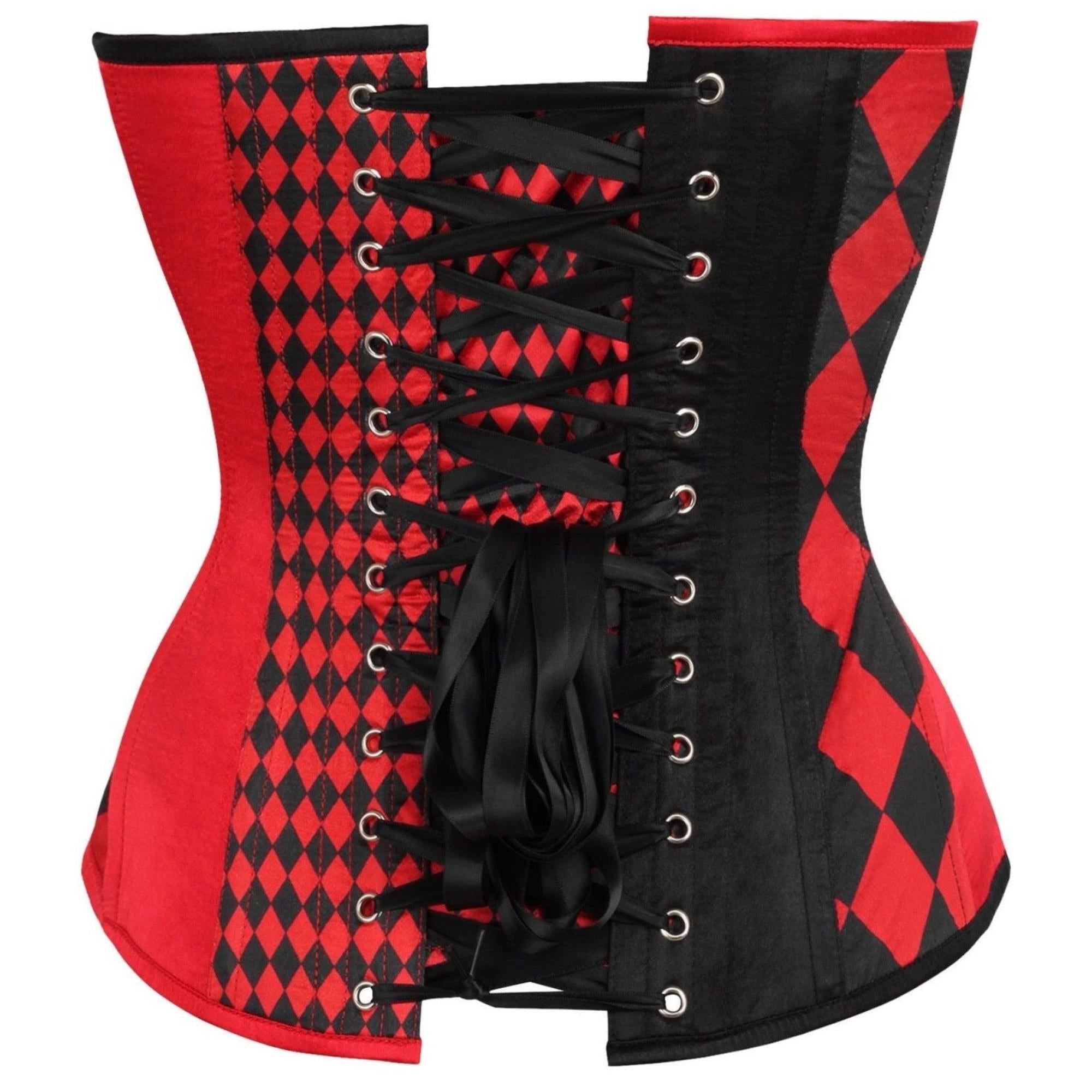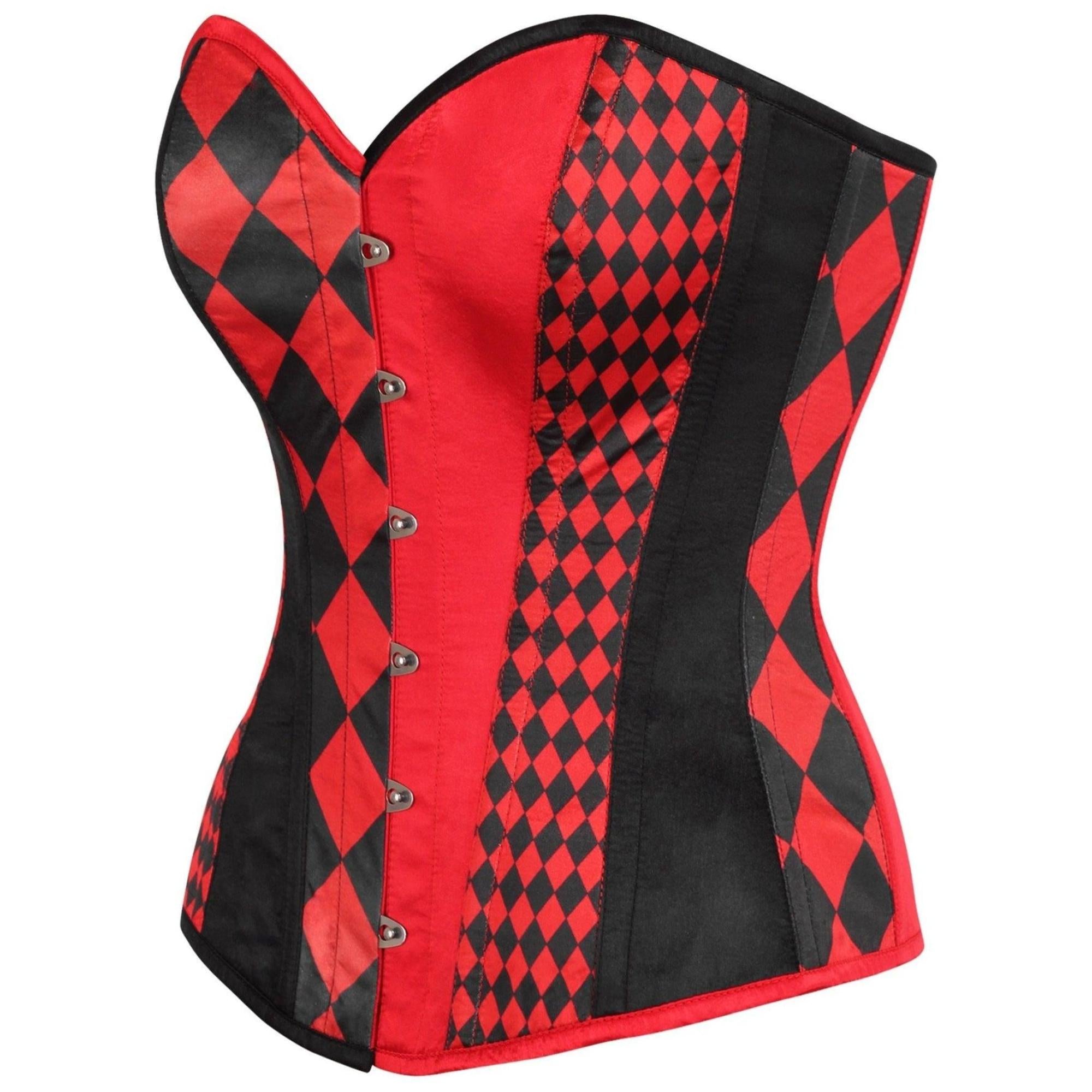 Elevate your style with our Top Drawer Black and Red Jester Print Steel Boned Corset. This overbust corset boasts a striking diamond checkered print in red and black, perfect for jester, clown, or Harley Quinn cosplay. With a front clasp closure and back lacing, it provides a comfortable fit while cinching your waist for a flattering silhouette.