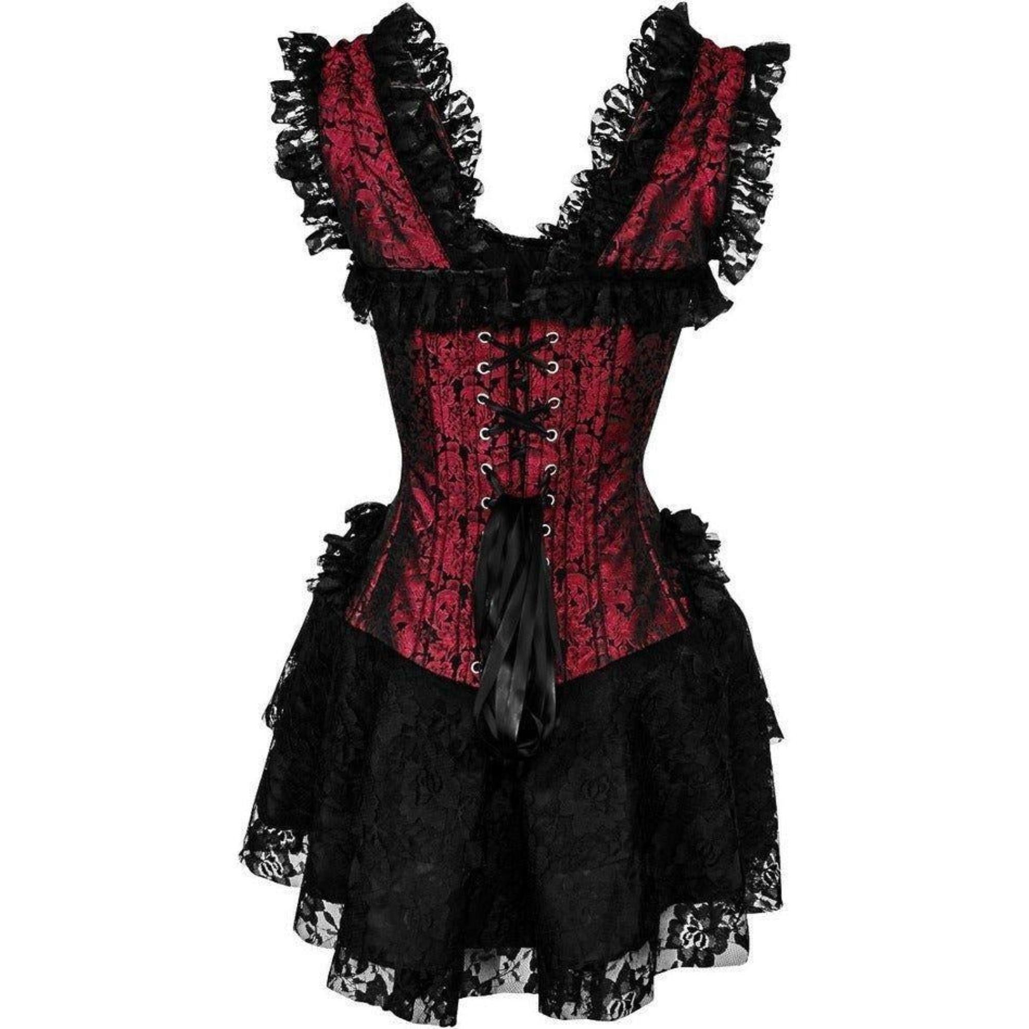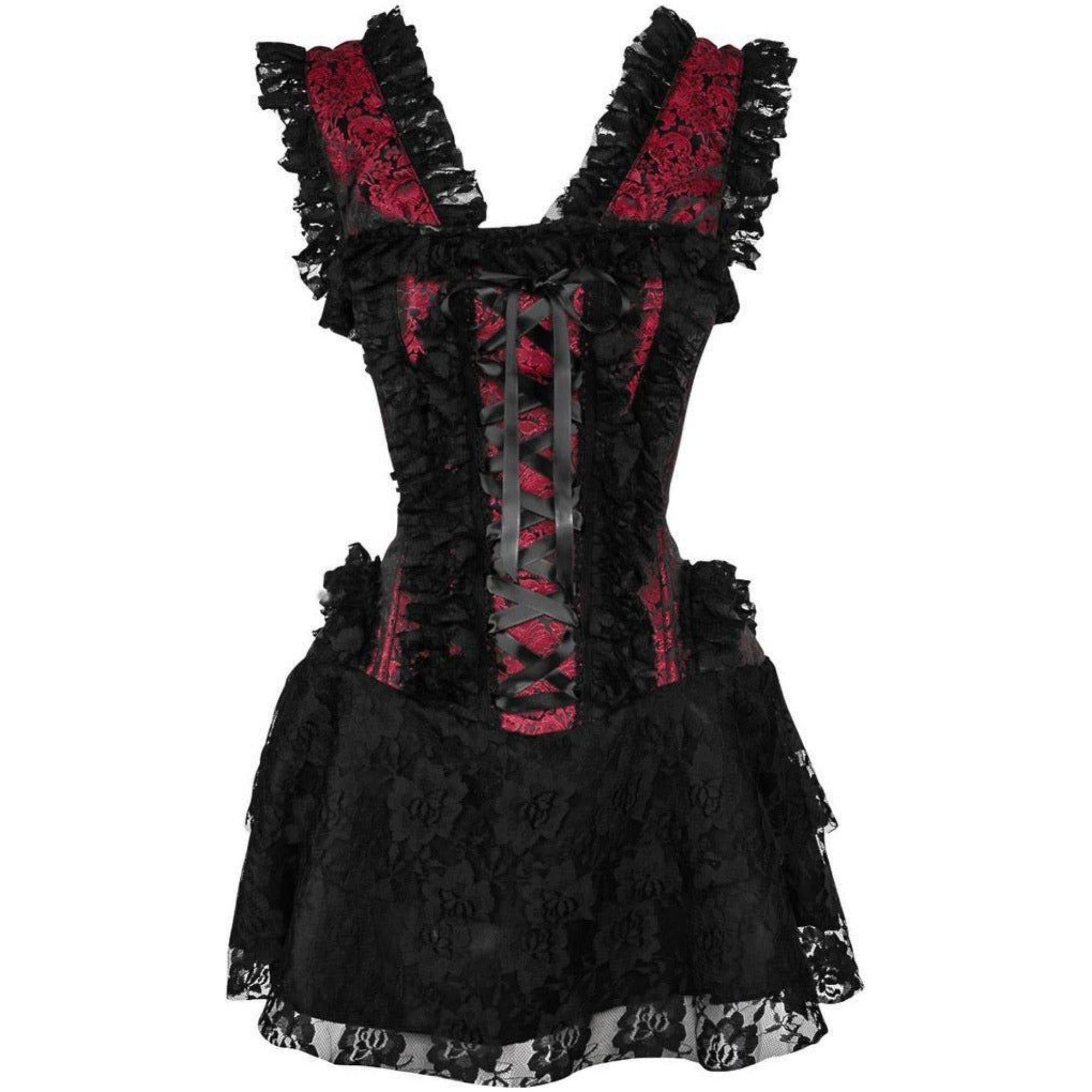 Get the best of both worlds with our Top Drawer Steel Boned Red/Black Lace Victorian Corset Dress. This lined dress features delicate lace details and versatile sleeves that can be worn on or off the shoulder. Available in sizes Small through 2X. Go from classy to sassy in one dress!