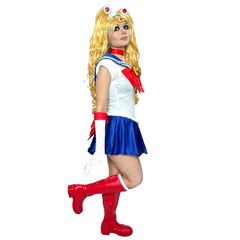 Take your cosplay game to the next level with this Tsukino Usagi Serena costume from Sailor Moon! Made with high-quality materials such as stretch cotton and uniform cloth, this costume comes complete with a dress, necklace, bows, gloves, headbands, socks and boots! (all boots are size 9 US) Perfect for any cosplay convention, this costume will make you stand out as the ultimate Sailor Moon fan!
