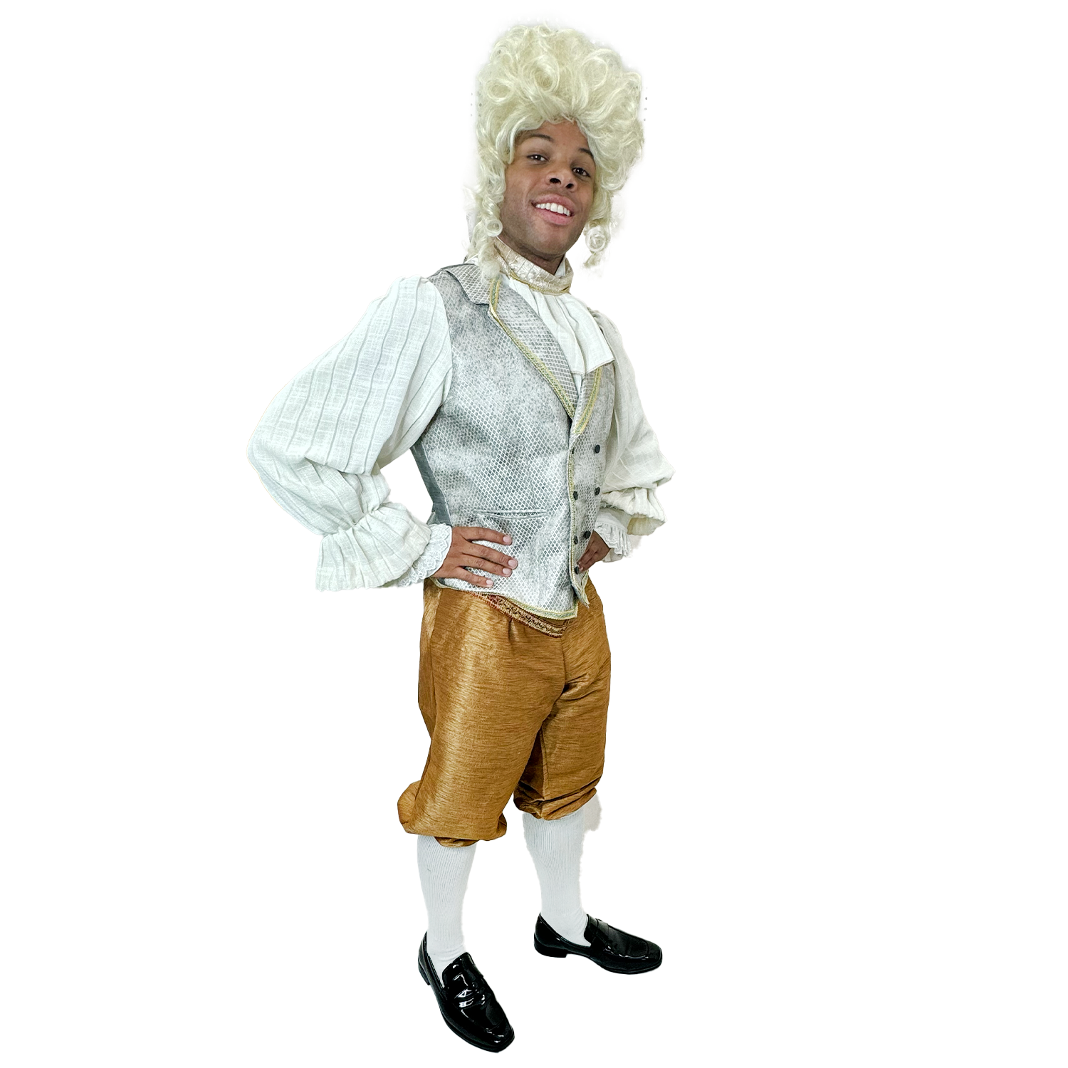 Step into the past with the Upper Class Colonial Lord Geoffrey Men's Adult Costume. This handmade, Abracadabra exclusive outfit features a stunning silver ornate colonial style vest with attached sleeves and brown pants. Add the attachable jabot collar and complete the look with a wig and accessories (sold separately). Available in size extra large. History comes to life with this Georgian-inspired costume.