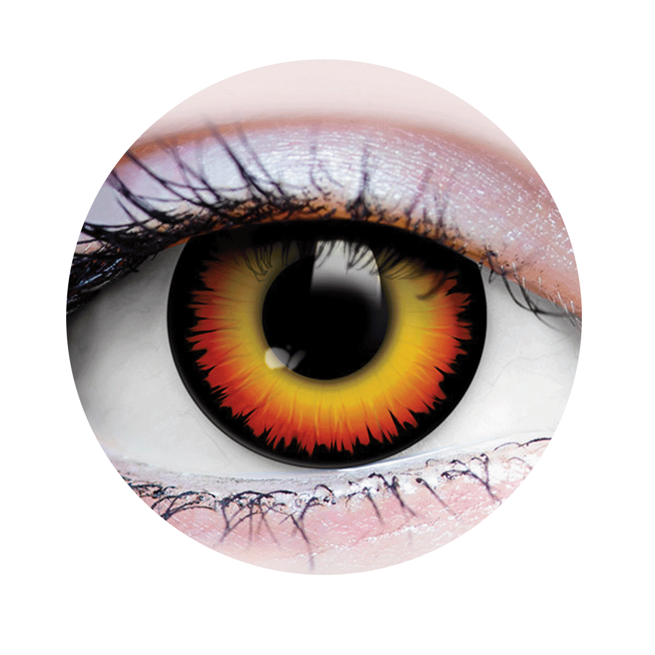 WEREWOLF II features a transparent pupil with an intense gradient of color erupting around your pupil, blazing from a sun-like yellow to a fiery orange. Encasing this display of primal rage is a bold outer ring of black streaks, slashing inwards like claws tearing through the night.