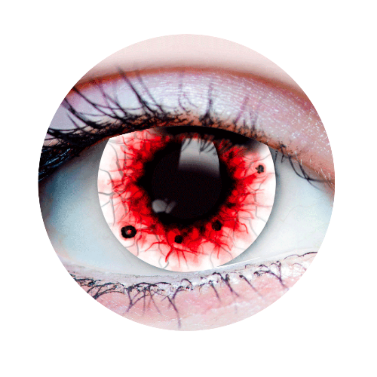 Wraith II Colored Contact Lenses can give you the ethereal gaze of a vengeful spirit or a spooky wraith. These lenses feature a transparent pupil with an opaque white background. Red veins and a blood cloud permeate the center of the lens, and black flecks spread throughout the iris to give a bewitching effect.