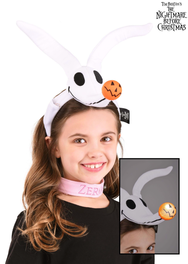 This Zero Light Up Plush Headband & Collar Kit comes with the ears sewn to fabric-covered plastic headband featuring bendable wire frames. The nose lights up via a built-in battery compartment is in a pocket on the headband. The collar has hook & loop fastener at back and even has Zero's name embroidered on it to complete the look. Best of all, it's officially licensed!